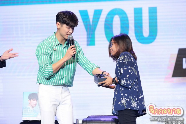 สุดท้ายเหลือผู้ชนะ 4 คนก็ถูกเชิญขึ้นมาบนเวที ซึ่งก่อนจะคัดเหลือผู้โชคดีหนึ่งคน มินฮยอก ก็ทำเซอร์ไพรส์ด้วยการเต้นเพลงสุดฮิต “คุกกี้เสี่ยงทาย” ของ BNK48 ไปพร้อมๆกับผู้โชคดี “ผมได้ยินมาว่าเพลงนี้กำลังฮิตที่เมืองไทย สนุกดีครับ ถึงผมจะเต้นไม่เก่งแต่ก็เต้นง่ายมาก” เลยเรียกเสียงกรี๊ดกันอีก จากนั้นก็มาคัดสาวผู้โชคดีให้เหลือเพียงคนเดียว มินฮยอก ก็ได้โชว์ทักษะภาษาไทยอีกคำ นั่นคือ “ไม่เป็นไร” ไม่ว่าแฟนคลับจะทำท่าตีเบสบอลผิด หรือไม่รู้จักท่าไอรอนแมน หนุ่มหล่อก็จะปลอบใจว่า “ไม่เป็นไร” เสมอ แล้วผู้ชนะในเกมนี้ก็ได้รับซองใส่พาสปอร์ต เทียนหอม ที่หนุ่มมินฮยอกเลือกซื้อเองพร้อมลายเซ็นเป็นของรางวัลไป