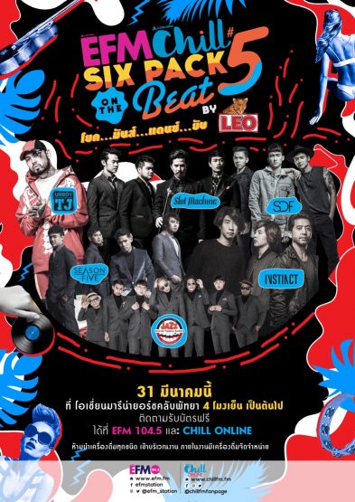 ในมหกรรมคอนเสิร์ตสุดเซ็กซี่ริมหาดพัทยา EFM Chill Six Pack on The Beat No.5 (อีเอฟเอ็ม ชิล ซิกแพค ออน เดอะ บีท ครั้งที่ 5) โยก…มันส์…แด๊นซ์…ยับ!! กับ 6 ศิลปิน สุดเฉียบ!! เอสดีเอฟ, อินสติงต์, ซีซั่น ไฟว์, ยัวร์บอยทีเจ, สล็อต แมชชีน และ แจ๊ส สปุ๊กนิค ปาปิยอง กุ๊กกุ๊ก แด๊นซ์มันส์ๆ ไปกับดีเจซุปตาร์แถวหน้าของเมืองไทยจาก อีเอฟเอ็ม 104.5 และ ชิล ออนไลน์ บนเวที EDM ในสไตล์ EFM พบกันวันเสาร์ที่ 31 มีนาคมนี้ ตั้งแต่เวลา 16.00 น. เป็นต้นไป ที่ โอเชี่ยน มารีน่า ยอร์ช คลับ พัทยา ติดตามรายละเอียดและกติกาการรับบัตรฟรีได้ที่ คลื่นอีเอฟเอ็ม 104.5 และ ชิล ออนไลน์ ทุกช่วงดีเจ หรือคลิ๊ก www.efm.fm และ www.chillfm.fm