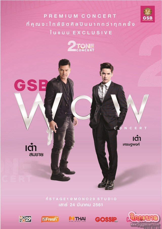 “ธนาคารออมสิน” ร่วมกับ “โมโน กรุ๊ป” จัดคอนเสิร์ตสุดพรีเมี่ยมเพื่อมอบให้ลูกค้า ธนาคารออมสิน ได้ร่วมกิจกรรมรับความบันเทิงกับการชมคอนเสิร์ต “GSB WOW CONCERT” ตลอดปี 2561 ภายใต้รูปแบบคอนเสิร์ตทั้ง 3 แบบ คือ 2 Tone Concert, Rewind 6 Degree และ Diva จากศิลปินชั้นนำของเมืองไทย พร้อมด้วยโปรดักชั่นสุดอลังการบนเวทีคอนเสิร์ตกับจอแอลอีดี 270 องศา พร้อมแสง สี เสียงตระการตา เพื่อเป็นการขอบคุณให้ลูกค้าคนพิเศษของธนาคารออมสินได้เข้าชมฟรี ประเดิมด้วยคอนเสิร์ตแรกกับศิลปินดังแห่งยุค 90 เต๋า-สมชาย เข็มกลัด ที่หวนจับไมค์ขึ้นเวทีคอนเสิร์ตอีกครั้งในรอบหลายปี พร้อมศิลปินรุ่นน้องชื่อเหมือนกัน เต๋า-เศรษฐพงศ์ เพียงพอ ในวันเสาร์ที่ 24 มีนาคมนี้ เวลาแสดง 14.00 น. (เวลาประตูเปิด 13.00 น. ) ณ สเตจ 1 STUDIO MONO29 (สตูดิโอ โมโนทเวนตี้ไนน์) ถนนชัยพฤกษ์