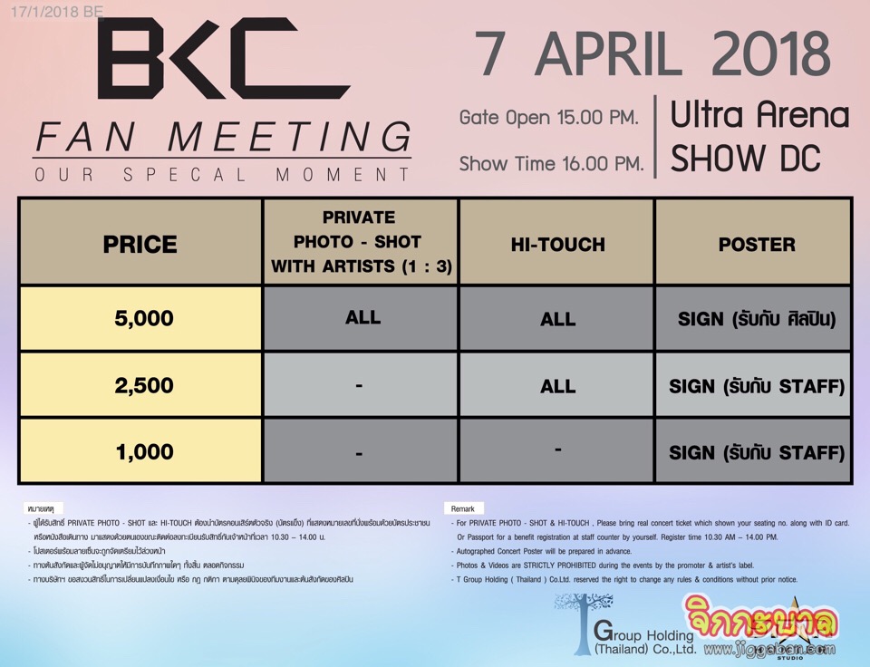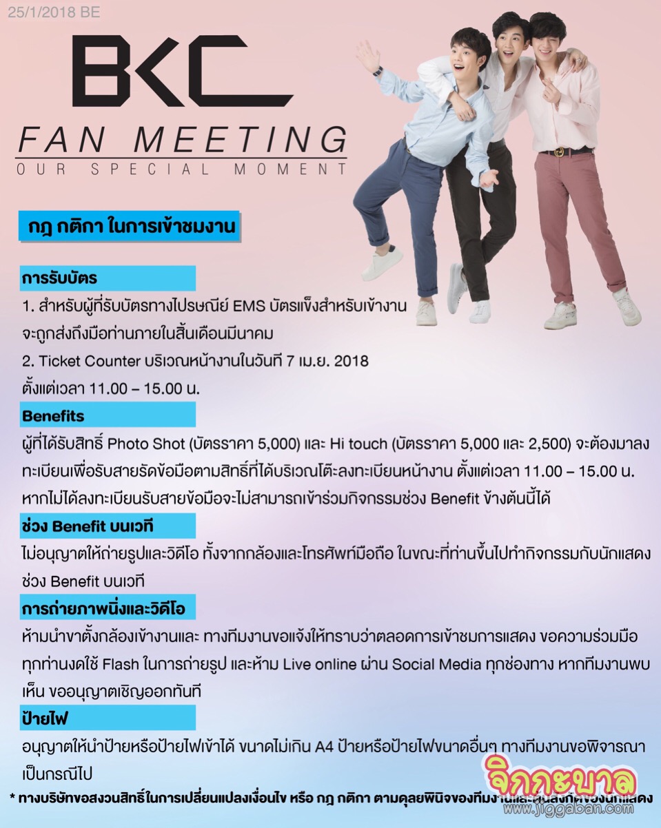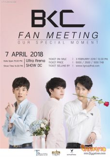 ใกล้เข้ามาทุกที!!! แทบจะนับวันรอพบความพิเศษที่ผู้จัดเจ้าเก่าใจดีอย่าง บริษัท ทีกรุ๊ป โฮลดิ้ง (ไทยแลนด์) จำกัด และ 3 หนุ่ม บาส – สุรเดช พินิวัตร, คิมม่อน – วโรดม เข็มมณฑา และคอปเตอร์ -ภานุวัฒน์ เกิดทองทวี เตรียมขนมามอบให้คนพิเศษ จัดเต็มทั้งความสนุก ความสุข ความทรงจำดีๆ อัดแน่นในงาน “BKC Fan Meeting – Our Special Moment” ในวันที่ 7 เมษายน 2561 เวลา 16:00 น. ณ Ultra Arena Show DC