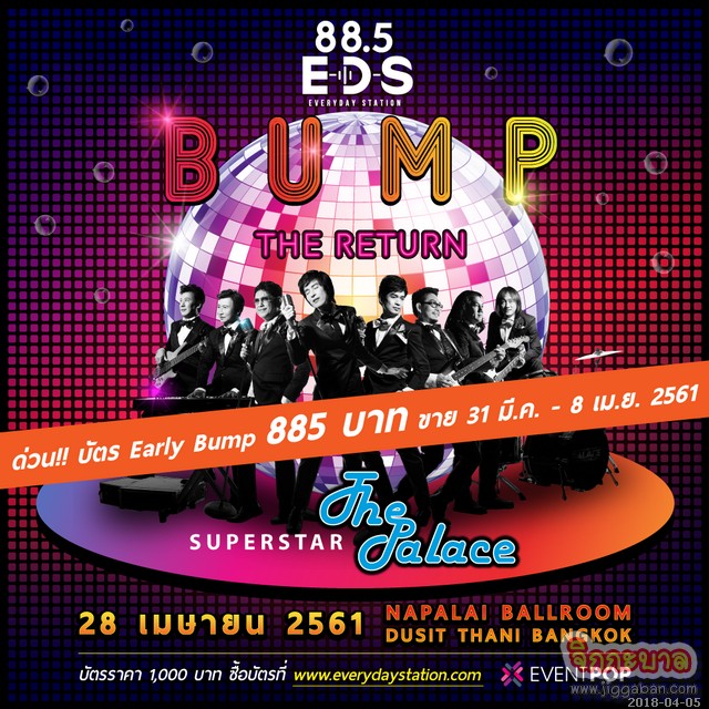 เตรียมพร้อม ซ้อม Bump แล้วพบกันวันเสาร์ที่ 28 เมษายนนี้ ที่ห้องนภาลัยบอลรูม โรงแรมดุสิตธานี พิเศษ!! สำหรับคนชอบ Bump ซื้อบัตรEarly Bump 885 บาท ได้ตั้งแต่วันที่ 31 มีนาคม – 8 เมษายนนี้เท่านั้น ซื้อบัตรได้ที่ www.everydaystation.com สอบถามข้อมูลเพิ่มเติมที่ Facebook 88.5 eds หรือโทร 02-514-1248 เตรียมร่างกายให้พร้อม ไหล่ สะโพก ก้น แล้วมา Bump ให้ฟลอร์สะเทือน Bump กันได้ทุกเพศ Bump กันได้ทุกวัย Bump กันมันส์แน่นอน