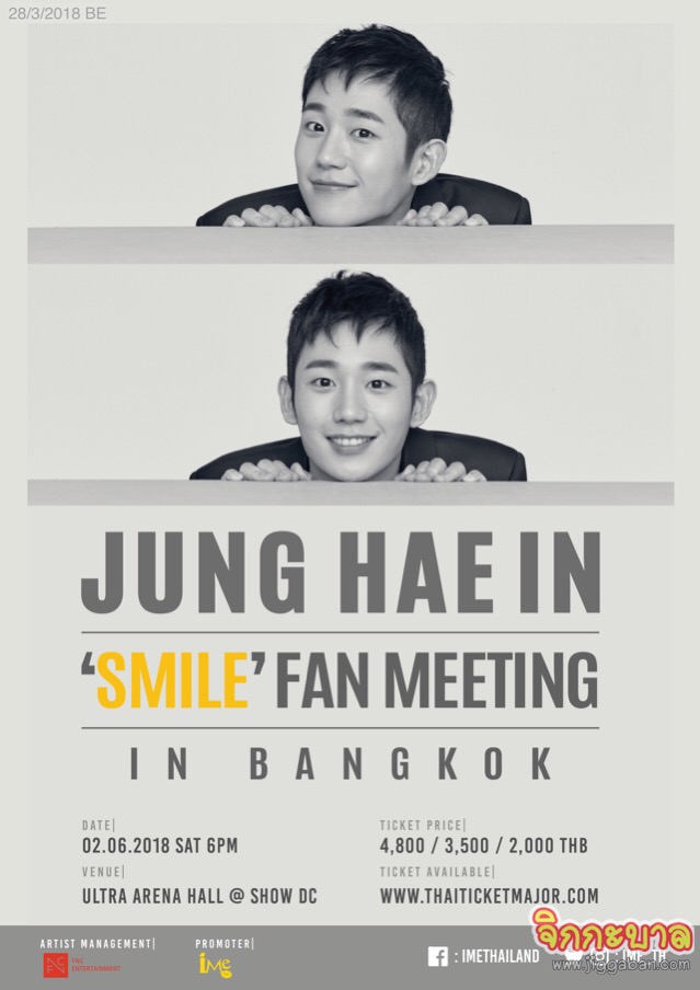 จองแฮอิน (Jung Hae In) นักแสดงหนุ่มดาวรุ่งจากค่าย FNC Entertainment ที่เพิ่งขึ้นแท่นมาเป็นพระเอกอย่างสมบูรณ์แบบในซีรีย์เรื่องล่าสุด “Pretty Noona Who Buys Me Food” แสดงคู่กับ ซนเยจิน นักแสดงสาวมากความสามารถ โดยก่อนหน้านี้แฮอินโด่งดัง และเป็นที่รู้จักมากขึ้นทั้งในประเทศเกาหลี และประเทศไทย จากการรับบท ฮันอูทัก (พระรอง) ในซีรีย์เรื่อง “While you were sleeping” ปีที่ผ่านมา จนเป็นกระแสความนิยมในโลกโซเชี่ยล และมีผู้ชื่นชอบติดตามผลงานอีกทั้งมีแฟนคลับเพิ่มขึ้นอย่างมากหลายเท่าตัว จนสามารถจัดงานแฟนมีทติ้งขึ้นทั้งในประเทศเกาหลี และประเทศไต้หวันในช่วงต้นปีที่ผ่านมา และตอนนี้ ไอมี่ไทยแลนด์ (iMe Thailand) จึงไม่รอช้าคว้าตัวสามีแห่งชาติคนล่าสุดของแฟนๆ คอซีรีย์เมืองไทย มาให้ได้พบปะกันอย่างใกล้ชิด พร้อมเตรียมความพิเศษสุด Exclusive มากมายเพื่อแฟนๆ ชาวไทยโดยเฉพาะอีกด้วย แล้วเตรียมตัวมาพบกับเขาได้ในงาน “JUNG HAE IN ‘SMILE’ FAN MEETING IN BANGKOK” ที่จะจัดขึ้นในวันเสาร์ที่ 2 มิถุนายน 2561 เวลา 18.00 น. ณ อัลตร้า อารีน่า ฮอลล์ ชั้น 6 โชว์ ดีซี เปิดจำหน่ายบัตรในวันเสาร์ที่ 5 พฤษภาคม 2561 เป็นต้นไป บัตรราคา 4,800 / 3,500 และ 2,000 บาท จำหน่ายบัตรผ่านทาง เคาน์เตอร์ไทยทิคเก็ตเมเจอร์ ทุกสาขา หรือ www.thaiticketmajor.com และ Call Center 02-262-3456