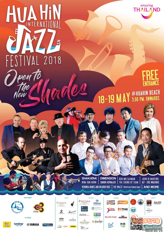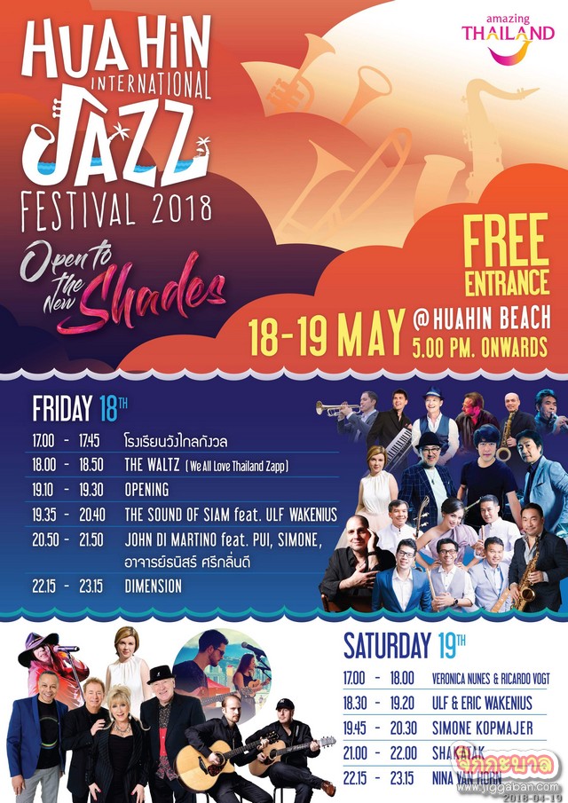 โดยปีนี้ “Hua Hin International Jazz Festival 2018 : Open To The New Shades” จัดขึ้นวันที่ 18-19 พฤษภาคม 2018 ณ ชายหาดหัวหิน จ.ประจวบคีรีขันธ์ (บริเวณด้านหน้าโรงแรมเซ็นทาราแกรนด์บีช รีสอร์ทแอนด์วิลลาหัวหิน) และยิ่งใหญ่กว่าทุกครั้งที่ผ่านมา ภายใต้แนวคิด Open To The New Shades กับแคมเปญโปรโมทการท่องเที่ยว ของการท่องเที่ยวแห่งประเทศไทย เพื่อให้นักท่องเที่ยวทั้งชาวไทยและต่างชาติเปิดรับประสบการณ์ใหม่ๆ ทางด้านการท่องเที่ยวเชิงดนตรี พร้อมกันนี้ได้เชิญสุดยอดศิลปินแจ๊สชื่อดังจากทั่วโลกอย่าง “Shakatak” วงแจ๊สฟังก์ชื่อดัง จากประเทศอังกฤษ / “Dimension” วงแจ๊สฟิวชั่น จากประเทศญี่ปุ่นที่จะมาแสดงในประเทศไทยเป็นครั้งแรก / “John Di Martino” ศิลปินอะคูสติค จากประเทศอเมริกา / “Nina Van Horn” ศิลปินบลูส์ จากประเทศฝรั่งเศส / “Ulf and Eric Wakenius” ศิลปินคู่ กีตาร์อะคูสติค จากประเทศสวีเดน / “Veronica Nunes and Ricardo Vogt” ศิลปินละติน บอสซา โนวา จากประเทศบราซิล “Simone Kopmajer” แจ๊สดีว่าชื่อดังจากประเทศออสเตรีย นอกจากนี้ยังมีไฮไลท์จากวง “The Sound of Siam” นำทีมโดย โก้ มิสเตอร์แซกแมน เจ้าพ่อเพลงแจ๊สของเมืองไทยที่มาร่วมมอบความสุขทางเสียงดนตรี และความบันเทิงให้กับแฟนดนตรีแจ๊สแบบเต็มอิ่ม ตั้งแต่เวลา 17.00-24.00 น. ภายในงานมี 2 เวทีให้เลือกชม ต้อนรับการเข้าชมงานกับเวที Open Stage เวทีที่รวมศิลปินดาวรุ่งน้องใหม่ เช่นวง Funktion วงSax Pack Girl รวมถึงวงน้องใหม่อีกคับคั่งที่พร้อมใจกันมาร่วมมอบความสุขทางเสียงเพลง และเพิ่มสีสันความสนุกสนานกับศิลปินรับเชิญวง “สินเจริญ บราเธอร์” และเวที BEACH STAGE พบกับกองทัพศิลปินแจ๊ส ที่คุณจะเพลินเพลินกับเสียงเพลงและบรรยากาศติดชายทะเลหัวหิน โดยทุกท่านสามารถเข้าร่วมงานได้ฟรี โดยไม่มีค่าใช้จ่ายใดๆทั้งสิ้น เพื่อตอกย้ำความเป็นเมืองแห่งการท่องเที่ยวระดับนานาชาติอย่างแท้จริง สามารถสอบถามข้อมูลเพิ่มเติมได้ที่ www.huahininterjazz.com หรือ Facebook Hua Hin International Jazz Festival