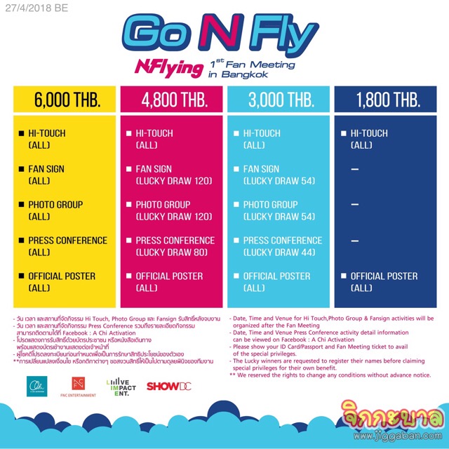 N.Fia ชาวไทย เตรียมตัวบินไปให้สุด แล้วหยุดที่ความฟิน!! ใน “เอ็น.ฟลายอิ้ง เฟิร์ส แฟน มีตติ้ง โก เอ็น ฟลาย’ อิน แบงคอก” (N.Flying 1st Fan meeting ‘Go N Fly’ in Bangkok) ในวันเสาร์ที่ 23 มิถุนายน 2561 นี้ เวลา 18.00 น. ณ อัลตร้า อารีน่า ชั้น 6 ศูนย์การค้าโชว์ ดีซี โดยจะเริ่มเปิดจำหน่ายบัตรใน วันเสาร์ที่ 19 พฤษภาคม 2561 เวลา 10.00 น. (เวลาท้องถิ่น) ทาง https://ticket.achi.co.th บัตรราคา 6,000 (VIP) / 4,800 / 3,000 / 1,800 บาท สามารถติดตามรายละเอียดเพิ่มเติมหรืออัพเดทข้อมูลได้ทางhttps://ticket.achi.co.th , Facebook : ACHIACTIVATION, Twitter : @achiactivation , Instagram : ACHI_ACTIVATION , Line @ACHI_ACITIVATION … ใครพร้อมแล้ว ติดปีกรอกันได้เลย!!