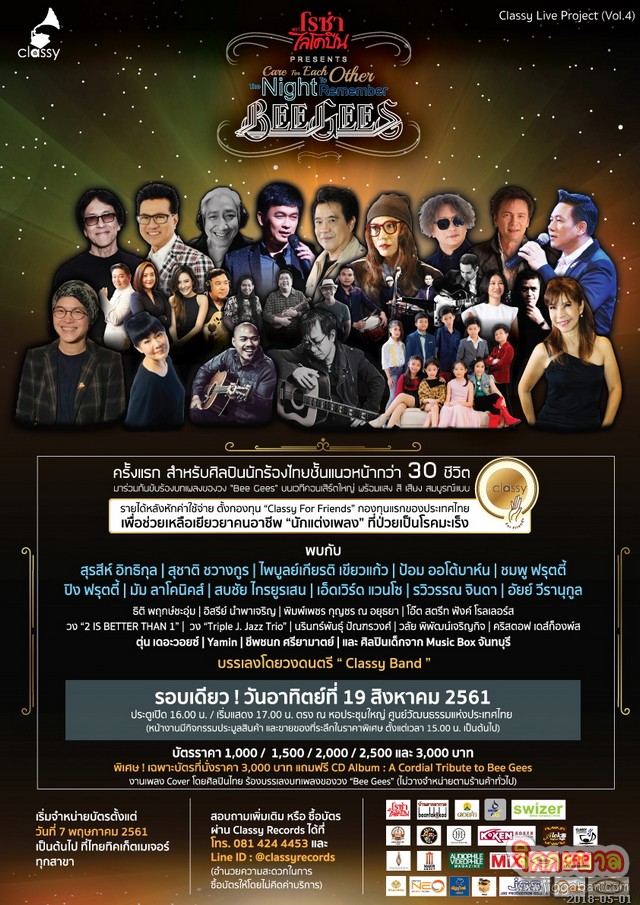 ครั้งแรกสำหรับศิลปินไทยชั้นแนวหน้า ที่จะมาร่วมกันขับร้องบทเพลงของวง “Bee Gees” วงดนตรีระดับตำนานชื่อดังในช่วงยุค 60 ของประเทศอังกฤษ ที่มีผลงานโด่งดังสุดขีดไปทั่วโลก ด้วยเพลงฮิตอย่าง “Stayin′ Alive”, “How Deep Is Your Love”, “Alone”, “Tragedy”, “I Started A Joke” และ “Massachusetts” ครั้งนี้ บริษัท คลาสส์ซี่ เรคคอร์ดส์ จำกัด (Classy Records) ค่ายเพลงที่เน้นผลิตผลงานเพลงคุณภาพ ได้จัดงานคอนเสิร์ตใหญ่ Classy Live Project (Vol.4) โรซ่าไลโคปีน P R E S E N T S “Care For Each Other: The Night To Remember Bee Gees” (แคร์ ฟอ อีส อาเท่อ เดอะ ไนท์ ทู รีเมมเบอร์ บีจีส์) เพื่อให้แฟนเพลงชาวไทยได้ชวนคิดถึงบทเพลงชื่อดังในยุคนั้นของ Bee Gees อีกครั้ง โดยขนศิลปินชื่อดังรุ่นใหญ่และรุ่นใหม่ที่มากความสามารถ พร้อมแสง สี เสียง ตระการตา บนเวทีแห่งนี้ พบกับ อ้อง-สุรสีห์ อิทธิกุล, ต้น-สุชาติ ชวางกูร, ปั่น-ไพบูลย์เกียรติ เขียวแก้ว, ป้อม-ออโต้บาห์น, ชมพู –ฟรุตตี้, ปิง-ฟรุตตี้, ทุย-เอ็ดเวิร์ด แวนโซ, โจ้- นรินทร์พันธุ์ ปัณฑรวงศ์, ซ้ง- ธิติ พฤกษ์ชะอุ่ม, อัยย์-วีรานุกูร, ฟอร์ด-สบชัย ไกรยูรเสน, มะเหมี่ยว- อิสรีย์ นำพาเจริญ, ปาล์มมี่- พิมพ์เพชร กุญชร ณ อยุธยา, โอ๊ต-จากวง “สตรีท ฟังค์ โรลเลอร์ส”, วง “2 is better than 1” , ตุ่น- อัฐพร กรไชยา จากเวทีเดอะวอยซ์, วง “Triple J. Jazz Trio”, คริสตอฟ เดส์ก็องพ์ส , ญามินท์-ภูวดล วีระเถียร, เจี๊ยบ-วลัย พิพัฒน์เจริญกิจ, อุ้ย- รวิวรรณ จินดา, ชีพชนก ศรียามาตย์, มัม- ลาโคนิค พร้อมด้วยศิลปินที่จะมาร่วมเซอร์ไพรส์ภายในงานนี้อีกมากมาย และศิลปินเด็กจาก Music Box จ. จันทบุรี ตลอดงานบรรเลงโดยวงดนตรี “Classy Band” โดยรายได้หลังหักค่าใช้จ่ายภายในงานนี้ จัดตั้งกองทุน “Classy For Friends” กองทุนแรกในประเทศไทย เพื่อช่วยเหลือค่ารักษาพยาบาลคนอาชีพ “นักแต่งเพลง” ที่ป่วยเป็นโรคมะเร็งอีกด้วย ซึ่งคอนเสิร์ตในครั้งนี้จะจัดขึ้นรอบเดียวเท่านั้น ในวันอาทิตย์ที่ 19 สิงหาคม 2561 ประตูเปิด 16.00 น. / เริ่มแสดง 17.00 น. ตรง ณ หอประชุมใหญ่ ศูนย์วัฒนธรรมแห่งประเทศไทย บัตรราคา 3,000, 2,500, 2,000, 1,500 และ 1,000 บาท พิเศษ ! เฉพาะบัตรที่นั่งราคา 3,000 บาท จะแถม CD Album “A Cordial Tribute to Bee Gees” (รับได้ที่หน้างาน) เริ่มจำหน่ายบัตรตั้งแต่วันที่ 7 พฤษภาคม 2561 เป็นต้นไป ซื้อบัตรได้ที่ ไทยทิคเก็ตเมเจอร์ ทุกสาขา สอบถามข้อมูลเพิ่มเติมได้ที่ www.facebook.com/ Classy Records หรือ Line ID : @classyrecords