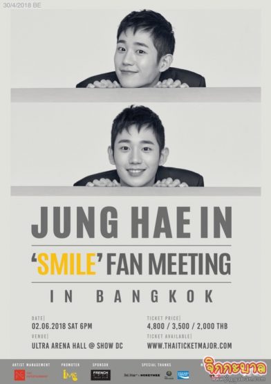 งานนี้เปิดขายบัตรเสาร์ที่ 5 พฤษภาคมนี้ และเขาพร้อมแล้วที่จะมาโปรยเสน่ห์ให้นูน่าไทยใจละลายในงาน “JUNG HAE IN ‘SMILE’ FAN MEETING IN BANGKOK” ซึ่งจะจัดขึ้นในวันเสาร์ที่ 2 มิถุนายน 2561 เวลา 18.00 น. ณ อัลตร้า อารีน่า ฮอลล์ ชั้น 6 โชว์ ดีซี บัตรราคา 4,800 / 3,500 และ 2,000 บาท จำหน่ายบัตรผ่านทาง เคาน์เตอร์ไทยทิคเก็ตเมเจอร์ ทุกสาขา หรือ www.thaiticketmajor.com และ Call Center 02-262-3456 หรือติดตามรายละเอียดเพิ่มเติมได้ที่ www.facebook.com/IMEthailand หรือ Twitter: @ime_th และ Instagram: @ime_th