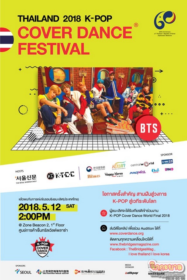 กลับมาอีกครั้งกับกิจกรรมสุดยิ่งใหญ่ กับการแข่งขันเพื่อเฟ้นหาสุดยอดตัวแทนจากประเทศไทยร่วมเข้าแข่งขันชิงแชมป์บนเวทีระดับโลก ในกิจกรรม “Thailand 2018 K-POP Cover Dance Festival” ซึ่งจัดขึ้นโดย บริษัท เค.ที.ซี.ซี จำกัด ร่วมกับ หนังสือพิมพ์ โซล นิวส์เปเปอร์ (Seoul Newspaper) , ศูนย์วัฒนธรรมเกาหลี ,กระทรวงความเท่าเทียมทางเพศและครอบครัว ซึ่งกิจกรรมในครั้งนี้ได้จัดขึ้นเพื่อเฉลิมฉลองการครบรอบ 60 ปี ความสัมพันธ์ไทย – เกาหลี และเพื่อเฟ้นหาตัวแทนจากประเทศไทยร่วมเดินทางเข้าแข่งขันเคป็อบคัฟเวอร์แดนซ์ ชิงแชมป์ระดับโลกบนเวที “K-POP Cover Dance World Final” ที่จัดขึ้นเป็นปีที่ 8 แล้ว โดยประเทศไทยได้สร้างความประหลาดใจให้กับแฟนๆทั่วโลกด้วยการคว้าแชมป์ชนะเลิศอันดับ 1 ถึงสามครั้งและรองชนะเลิศอันดับ 1 บนเวทีโลก ในปีนี้จึงเป็นอีกปีที่น่าติดตามและน่าจับตามองสำหรับตัวแทนเยาวชนไทย ซึ่งการแข่งขันรอบสุดท้ายจะจัดขึ้นที่ โซล ซิตี้ สแควร์ ในวันที่ 23 มิถุนายน 2561 ผู้ชนะจะได้เข้าร่วมโปรแกรมพิเศษ อาทิ คลาสสอนเต้นจากนักออกแบบท่าเต้นชื่อดังของเกาหลี , การฝึกภาษาเกาหลี , ร่วมกิจกรรมเต้นแฟลช ม็อบ และทริปท่องเที่ยวประเทศเกาหลีใต้ พร้อมของรางวัลที่น่าสนใจอื่นๆอีกมากมาย ภายในงานพบกับ 5 สาวจากวง Rose Quartz! เกิร์ลกรุ๊ป 3 สัญชาติ ได้แก่ เกาหลี,ไทย และพม่า ที่จะมาเปิดตัวพร้อมโชว์พลังร้อง พลังเต้น เป็นที่แรกหลังจากเดบิวต์ โดยคุณฮง จี ฮี ที่ปรึกษาประธานธิบดีสาธารณรัฐเกาหลีประจำประเทศไทยและประธานกระทรวงความเท่าเทียมทางเพศและครอบครัว ได้พูดถึงกิจกรรมในครั้งนี้ว่าเป็น กิจกรรมที่จัดขึ้นเพื่อส่งเสริมให้เยาวชนได้ใช้เวลาว่างให้เกิดประโยชน์และเพื่อสนับสนุนเยาวชนไทยที่มีความสามารถได้ก้าวสู่เวทีระดับโลก ซึ่งงานจะจัดขึ้นในวันเสาร์ที่ 12 พฤษภาคม 2561 ตั้งแต่เวลา 12.00 – 17.00 น. ณ โซนบีคอน 2 ศูนย์การค้าเซ็นทรัลเวิร์ล