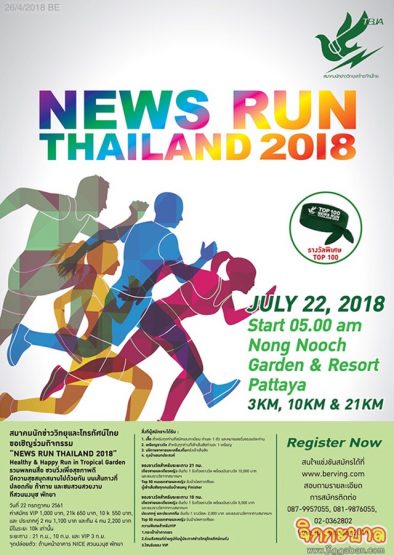 จัดวิ่ง “NEWS RUN THAILAND 2018” ครั้งแรกในประเทศไทย สานสัมพันธ์คนข่าวและประชาชน ชวนวิ่งเพื่อสุขภาพดี, ชมสวนสวย และไดโนเสาร์หลากสายพันธ์จากทั่วโลกกว่าสี่ร้อยตัว พร้อมวิ่งกระทบไหล่กับผู้ประกาศข่าวคนดังมากมายที่สวนนงนุช พัทยา 22 กรกฎาคมนี้
