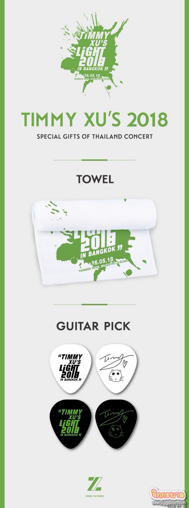 Here are the surprise gifts specially prepared by Timmy Xu and Timmy’s Studio for a concert in Thailand only! ….. The official gifts are cheering banners and guitar picks~ Fans who bought tickets of this concert are entitled to get these gifts by presenting your ticket at registration counter service on 26 May 2018 from 11.00 – 17.00 pm. …See you all on 26 May 2018~