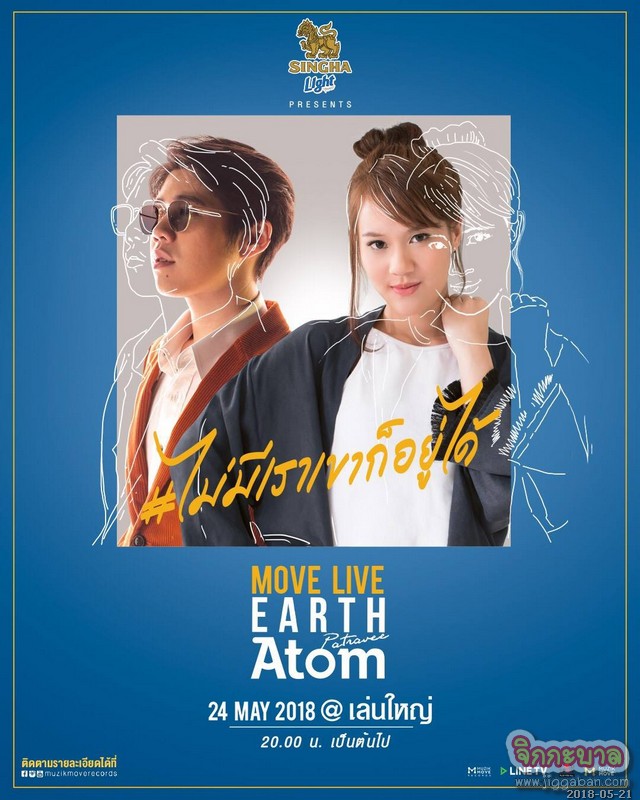 กลับมาอีกครั้งของคอนเสิร์ตไซส์มินิ สุดอบอุ่น อย่าง มูฟไลฟ์ คอนเสิร์ต ที่มีชื่อว่า “Singha Light X Move Live Earth & Atom #ไม่มีเราเขาก็อยู่ได้” (สิงห์ไลท์ พรีเซนต์ มูฟไลฟ์ เอิ๊ต และอะตอม ตอน ไม่มีเราเขาก็อยู่ได้) ของค่าย มิวซิกมูฟ เรคคอร์ดส ในเครือบริษัท มิวซิก มูฟ จำกัด ซึ่งจะเกิดขึ้นในวันพฤหัสบดีที่ 24 พฤษภาคมนี้ ณ ร้านเล่นใหญ่ รัชโยธิน ตั่งแต่เวลา 20.00 น. เป็นต้นไป งานนี้เข้าฟรี!! สำหรับผู้ที่มีอายุ 20 ปีขึ้นไป