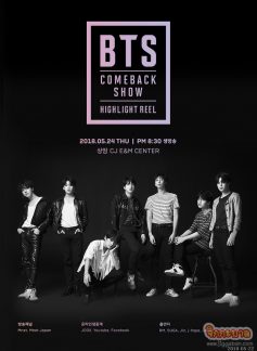 ตารางถ่ายทอดสด “BTS Comeback Show – Highlight Reel” เวลาในประเทศไทย 18.30 น. ตามเวลาท้องถิ่น เตรียมตัวให้พร้อมก่อนรับชม “BTS Comeback Show” ด้วยการฟังเพลงในอัลบั้มใหม่ “LOVE YOURSELF: Tear”