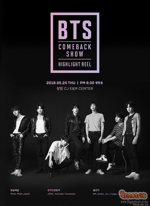 BTS Comeback Show” กับโชว์สุดเอ็กซ์คลูซีฟ แฟนคลับ BTS ตัวจริง สามารถรับชมการแสดงสุดตื่นเต้นจากศิลปินที่ทุกคนรอคอยกับ “BTS Comeback Show – Highlight Reel” ชมฟรีผ่าน JOOX ในวันที่ 24 พฤษภาคมนี้ เต็มอิ่มกับโชว์กว่า 70 นาที ผู้ชมจะได้เพลิดเพลินไปกับแฟชั่นแบบจัดเต็มบนเวที พร้อมบทสัมภาษณ์และการแสดงสุดประทับใจบนเวทีจากสมาชิกหนุ่มหล่อทั้ง 7 คนของ BTS ไม่ว่าจะเป็น วี, จิน, จีมิน, จองกุก, อาร์เอ็ม, ชูก้า และ เจโฮป