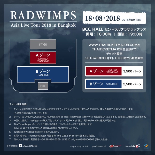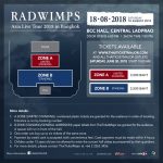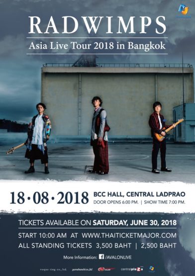 ถ้าหากคุณไม่อยากพลาดคอนเสิร์ตดีๆ แบบนี้ และพร้อมปิดฉากเอเชียทัวร์ 2018 ร่วมกันกับพวกเขา ย้ำกันอีกครั้ง “RADWIMPS Asia Live Tour 2018 in Bangkok” จะเปิดขายบัตรในวันเสาร์ที่ 30 มิถุนายน 2561 ตั้งแต่เวลา 10.00 น. เป็นต้นไป ทาง http://www.thaiticketmajor.com บัตรราคา 3,500 และ 2,500 บาท (บัตรยืนทั้งหมด) รายละเอียดเพิ่มเติมสามารถติดตามได้ที่ https://www.facebook.com/AVALONLIVE