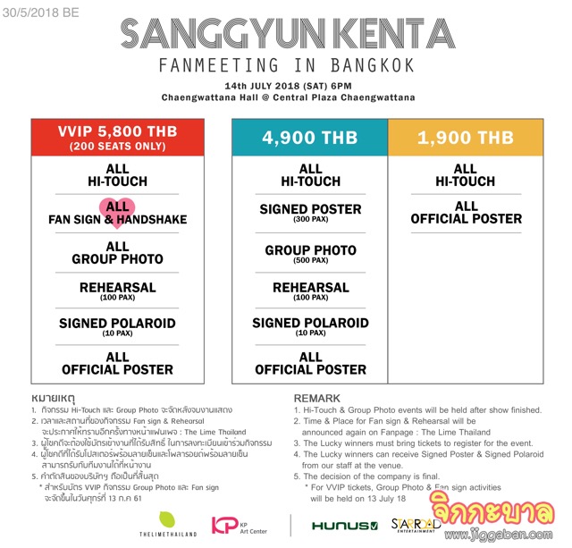 หากใครไม่อยากพลาดความประทับใจดีๆ เคลียร์คิวให้พร้อม และมาเจอพวกเขาได้ในงาน 2018 SANGGYUN KENTA FANMEETING IN BANGKOK ในวันเสาร์ที่ 14 กรกฎาคม 2561 ณ แจ้งวัฒนะฮอลล์ ศูนย์การค้าเซ็นทรัลพลาซ่าแจ้งวัฒนะ เปิดจองบัตรวันอาทิตย์ที่ 17 มิถุนายนนี้ ทาง www.thelimethailand.com บัตรราคา 5,800 (VVIP) / 4,900 และ 1,900 บาท งานนี้บอกเลยว่าสิทธิพิเศษแน่นเอี๊ยด มีแต่คุ้มกับคุ้มล้านเปอร์เซ็นต์ ติดตามรายละเอียดเพิ่มเติมได้ที่เฟซบุ๊คแฟนเพจ https://www.facebook.com/TheLimeThailand/ แล้วมาพิสูจน์ความคิดถึงจากพวกเขาด้วยตัวคุณเอง!!
