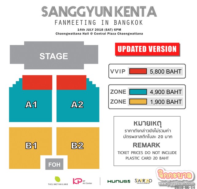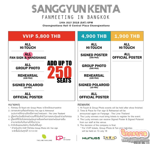 ขอย้ำอีกครั้ง งานนี้พลาดแล้วพลาดเลย!! งาน 2018 SANGGYUN KENTA FANMEETING IN BANGKOK เปิดจองบัตรวันอาทิตย์ที่ 17 มิถุนายนนี้ ทาง www.thelimethailand.com บัตรราคา 5,800 (VVIP) / 4,900 และ 1,900 บาท และพิเศษสุดๆ ผู้จัด The Lime ใจดีเพิ่มจำนวนบัตร VVIP จาก 200 ที่นั่ง เป็น 250 ที่นั่งอีกด้วย ติดตามรายละเอียดเพิ่มเติมได้ที่เฟซบุ๊คแฟนเพจ https://www.facebook.com/TheLimeThailand/