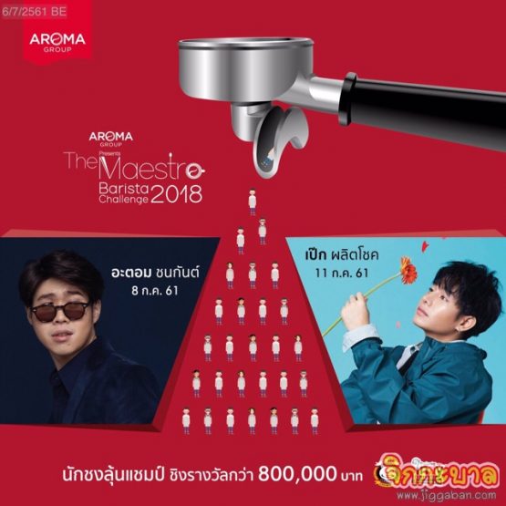 อโรม่า กรุ๊ป ชวนคอกาแฟร่วมเชียร์คนไทยให้ดังไกลถึงอิตาลี กับการแข่งขัน The Maestro Barista Challenge 2018 ชิงรางวัลกว่า 800,000 บาท ผู้ชนะจะได้เป็นตัวแทนประเทศไทยไปแข่งต่อที่อิตาลี และส่งเสียงกรี๊ดดังๆ กับมินิคอนเสิร์ตสุดมันส์ จากศิลปินชื่อดัง วันอาทิตย์ที่ 8 กรกฎาคม 2561 พบ อะตอม-ชนกันต์ และ วันอังคารที่ 11 กรกฎาคม 2561 พบ เป็ก-ผลิตโชค