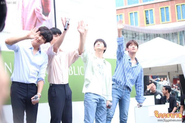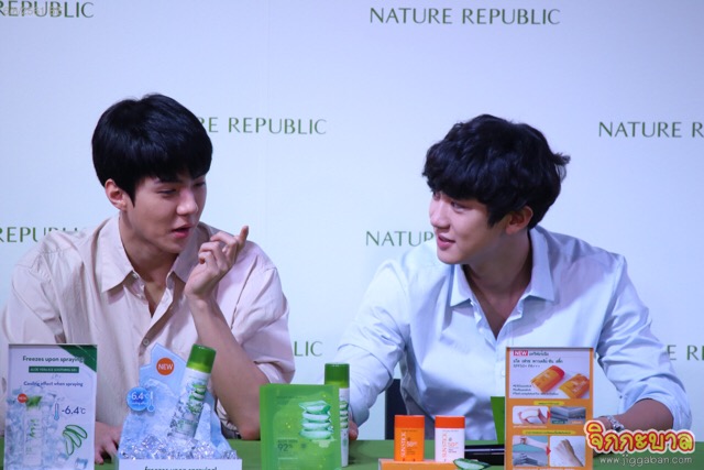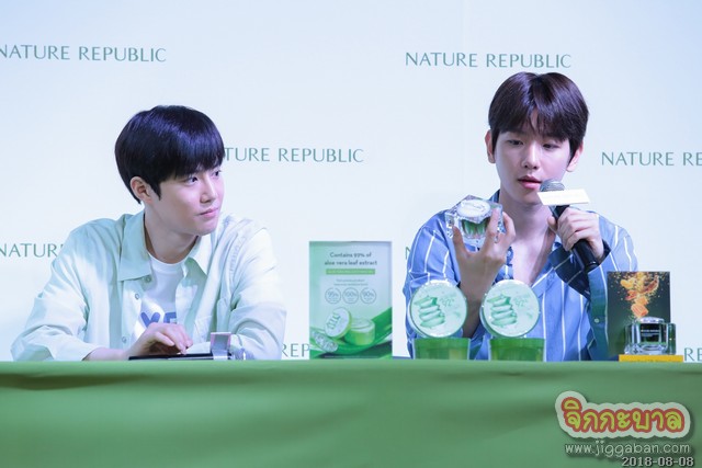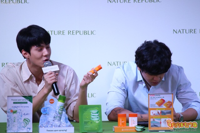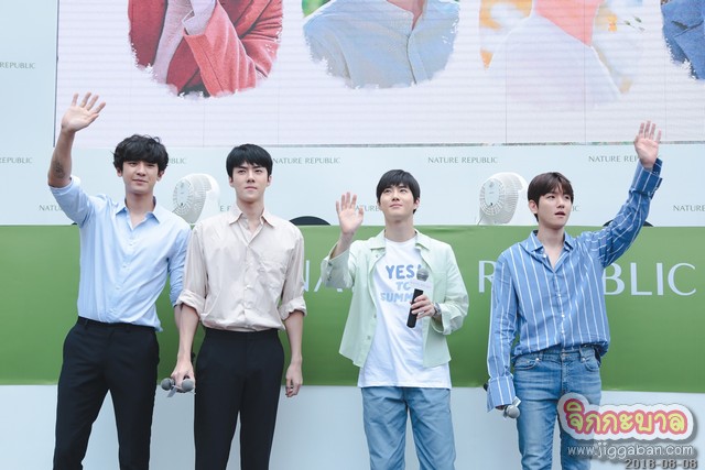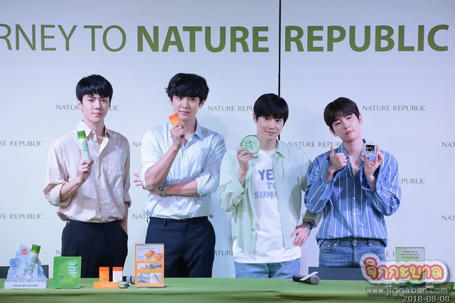 เริ่มต้นงานแถลงข่าวอย่างเป็นทางการด้วยการเปิด VTR ของ Nature Republic ก่อนเชิญ 4 หนุ่มสุดฮอตขึ้นมาบนเวทีเพื่อเริ่มพูดคุยถึงการกลับมาเมืองไทยอีกครั้งเพื่อร่วมแสดงความยินดีครั้งนี้ด้วยบรรยากาศที่เป็นกันเอง “พวกผมได้ข่าวว่า Nature Republic ที่พวกเราเป็นพรีเซนเตอร์ได้เปิดตัวผลิตภัณฑ์กันแดดใหม่ที่ใส่ใจสุขภาพผิว ที่พวกผมว่าเหมาะมากๆสำหรับเมืองร้อนอย่างประเทศไทย จึงได้มีโอกาสกลับมาเมืองไทยอีกครั้ง เพื่อแสดงความยินดีและได้มาเจอกับทุกคนอีกครั้งครับ” .. แถมงานนี้หนุ่มๆยังแอบเผยเคล็ดลับการดูแลผิวกับสื่อมวลชนอีกว่า “ปกติก็ใช้สินค้าของ Nature Republic เพื่อดูแลผิว เป็นประจำครับ และด้วยที่ช่วงนี้เป็นอากาศร้อนเป็นพิเศษ ผลิตภัณฑ์กันแดดจึงเป็นสิ่งที่พวกผมขาดไม่ได้เลยครับ พวกผมเลยได้ใช้ CALIFORNIA ALOE FRESH POWERY SUN STICK SPF50++ PA+++ มันดีมากเลยครับ นอกจากกันแดดได้ดีเพราะมี SPFสูงถึง 50+++ ไม่เหนียวเหนอะหนะ ทาแล้วรู้สึกสดชื่นอีกด้วย เหมาะกับอากาศร้อนแบบสุดๆ แถมยังพกพาสะดวกเพราะเป็นแบบ STICK สามารถพกไปไหนมาไหนติดตัวได้ตลอดเลยครับ”