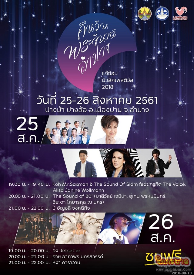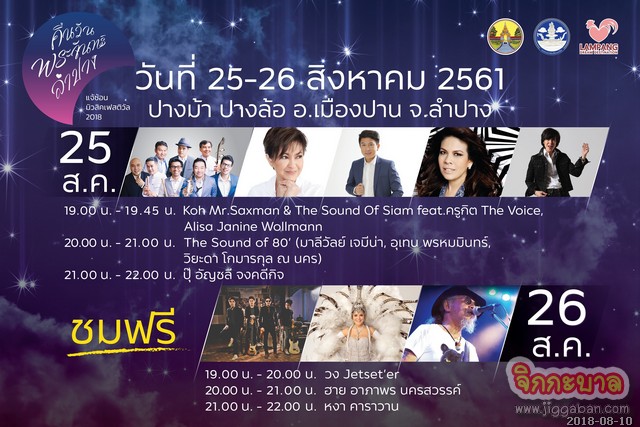 จังหวัดลำปางจัดทัพศิลปินมากมายกว่า 50 ชีวิต ร่วมงาน “แจ้ซ้อนมิวสิคเฟสติวัล 2018” ในวันที่ 25 -26 สิงหาคมนี้ ณ ปางม้า ปางล้อ อำเภอเมืองปาน จังหวัดลำปาง ซึ่งนำทัพโดย Koh Mr. Saxman & The Sound of Siam fat. ครูกิต The Voice, Alisa Janine Wollman, The Sound of 80’ (มาลีวัล เจมีน่า, อุเทน พรหมมินทร์, วิยะดา โกมารกุล ณ นคร), ปุ๊ อัญชลี จงคดีกิจ, Jetset’er, ฮาย อาภาพร นครสวรรค์ และ หงา คาราวาน พร้อมกิจกรรมแห่งความสุข ความฝัน จินตนาการหวานซึ้ง ในบรรยากาศแห่งความโรแมนติคของคืนวันพระจันทร์ ลำปาง Music in the moon light เทศกาลดนตรีที่จะทำให้หัวใจของคุณพองโตไปกับบรรยากาศสุดแสนจะโรแมนติคของจังหวัดลำปาง ในค่ำคืนที่พระจันทร์ส่องแสงสว่างไสวไปทั่วเมืองและในค่ำคืนที่ดวงดาวแอบยิ้มหวานให้กับพระจันทร์