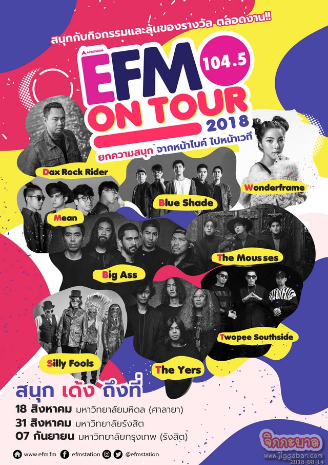 เหล่าเฟรชชี่น้องใหม่เตรียมตัวกันให้พร้อม คลื่นอีเอฟเอ็ม 104.5 เพลงเพราะ อารมณ์ดี กำลังจะยกความสนุกจากหน้าไมค์ไปไว้บนเวทีให้ได้มันส์กันถึงที่ กับกิจกรรม EFM on Tour (อีเอฟเอ็ม ออน ทัวร์) พบกับมินิคอนเสิร์ตจากศิลปินสุดฮอตและดีเจซุปตาร์ชั้นนำของเมืองไทย จัดไปเต็มๆ กันถึง 3 มหาวิทยาลัยแบบไม่ต้องพัก วันเสาร์ที่ 18 สิงหาคมนี้ ที่มหาวิทยาลัยมหิดล ศาลายา พบกับ Wonder Frame, Blue Shade, Mean ต่อด้วยวันศุกร์ที่ 31 สิงหาคม ที่มหาวิทยาลัยรังสิต พบกับ Twopee Southside, Silly Fools, Dax Rock Rider และปิดท้ายวันศุกร์ที่ 7 กันยายน ที่มหาวิทยาลัยกรุงเทพ วิทยาเขตรังสิต พบกับ Big Ass, The Mousses, The Yers พร้อมด้วย ดีเจ.เชาเชา, ดีเจ.ต้นหอม, ดีเจ.มะตูม, ดีเจ.แนน และดีเจอีกหลายคนที่จะไปเสริมทัพเรียกเสียงฮากันถึงที่ แถมยังได้ร่วมสนุกกับกิจกรรมและลุ้นของรางวัลอีกเพียบตลอดทั้งงาน ติดตามรายละเอียดเพิ่มเติมได้ที่ อีเอฟเอ็ม 104.5 หรือคลิ๊กที่ www.efm.fm