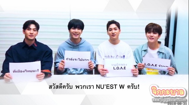 งานนี้ไม่ได้มโนไปเอง! เพราะสี่หนุ่ม “นิวอีสต์ ดับเบิลยู” (NU’EST W) นั้นก็อดใจรอให้ถึงวันคอนเสิร์ตไม่ไหวแล้ว เลยขอแวบมาอวดภาษาไทยที่ได้ติวเตอร์ดีจนทำให้ทักษะแอดวานซ์ไปอีกขั้น พร้อมสปอยล์ความพิเศษซึ่งยืนยันเป็นเสียงเดียวกันว่าต้องมาพิสูจน์ด้วยตนเองให้ได้!! “สวัสดีครับ พวกเรา NU’EST W ครับ! L.O.Λ.E จ๋า~นยูบึลของ L.O.Λ.E กำลังจะไปหาที่เมืองไทยนะ! (ภาษาไทย)… วู้วววว เป็นไงบ้างครับ สกิลภาษาไทยของพวกเราดีขึ้นมากเลยใช่มั้ยครับ? เพราะว่าเรามีครูสอนภาษาไทย คือ มินกิ (เร็น) ของพวกเรานั่นเอง!!ทำให้พวกเรา NU’EST W ได้เรียนภาษาไทยเพิ่มขึ้นอีกนิดนึง ว่าแล้วก็อยากไปเมืองไทยอีกครั้งเร็วๆ จังเลย พวกเรากำลังจะมีคอนเสิร์ตที่ชื่อว่า NU’EST W CONCERT