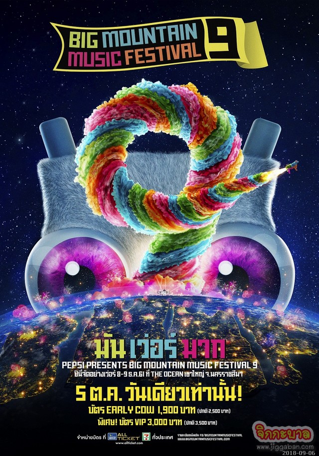 ความเว่อร์ปีนี้ของ Pepsi Presents Big Mountain Music Festival 9 (เป็ปซี่ พรีเซนต์ บิ๊ก เมาน์เท่น มิวสิค เฟสติวัล 9) ‘มัน เว่อร์ มาก’ จะจัดขึ้น 2 วัน 2 คืน วันที่ 8-9 ธันวาคม 2561 ณ ดิ โอเชี่ยน เขาใหญ่ จ.นครราชสีมา โดยเปิดจำหน่ายบัตร Early Cow ราคาเพียง 1,900 บาท (จากราคาปกติ 2,500 บาท) และ บัตร VIP Early Cow ราคาเพียง 3,000 บาท (จากราคาปกติ 3,500 บาท) วันที่ 5 ตุลาคมนี้ เพียงวันเดียวเท่านั้น!!! ซื้อบัตรได้ที่เคาน์เตอร์เซอร์วิส ออลล์ ทิคเก็ต ในร้านเซเว่นอีเลฟเว่น ทั่วประเทศ หรือ www.allticket.com สามารถติดตามรายละเอียดเพิ่มเติมที่ FB : BigMountainMusicFestival และ www.bigmountainmusicfestival.com