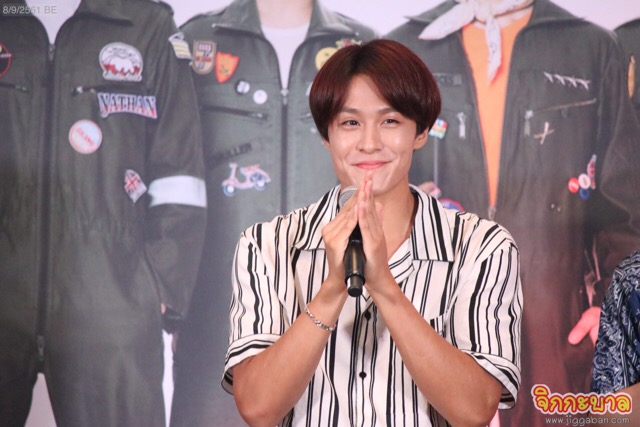 มาถึงคำถามท้ายๆ “ได้เตรียมภาษาไทยมาเพื่องานนี้กันบ้างมั้ย?” ซึงฮยอบบอกว่า “ไล่อันดับคนที่อายุน้อยสุด 3 คน ไปเข้าคอร์สเรียนภาษาไทยมาเลยครับ” ชาฮุนรีบออกตัว “แต่ว่าตอนนี้ลืมหมดแล้ว” แจฮยอนบอกว่ามีเพิ่งเรียนมา แล้วพูดขึ้นเสียงดัง “เจ๋ง” (รู้ด้วยนะว่าแปลว่า เยี่ยม) ชาฮุนอวดบ้าง “ผมก็มีครับ เป็นคำที่จำเป็นมากที่สุดเวลาอยู่เมืองไทย ‘อยากกินปูผัดผงกะหรี่นะครับ’” (พูดชัดและเร็วมาก) แจฮยอนขอพูดอีก “เจ๋ง ปูผัดผงกะหรี่เจ๋ง” (ว่าแล้วก็แตะมือแท็กทีมกัน) ฮเวซึงขออุบไว้ก่อน “ผมเตรียมมานะ แต่ผมพูดที่นี่วันนี้ไม่ได้ครับ ผมเตรียมมาเพื่อพรุ่งนี้เลย” ซึงฮยอบก็เหมือนกัน “ผมก็ไม่สามารถพูดโชว์ตรงนี้ได้ มันซ้ำกันน่ะครับ” กวังจินไม่พูดเยอะเพราะเจ็บคอ “ผมรักคุณ” และ “อันนี้ อันนี้” (พร้อมชี้มือประกอบ)