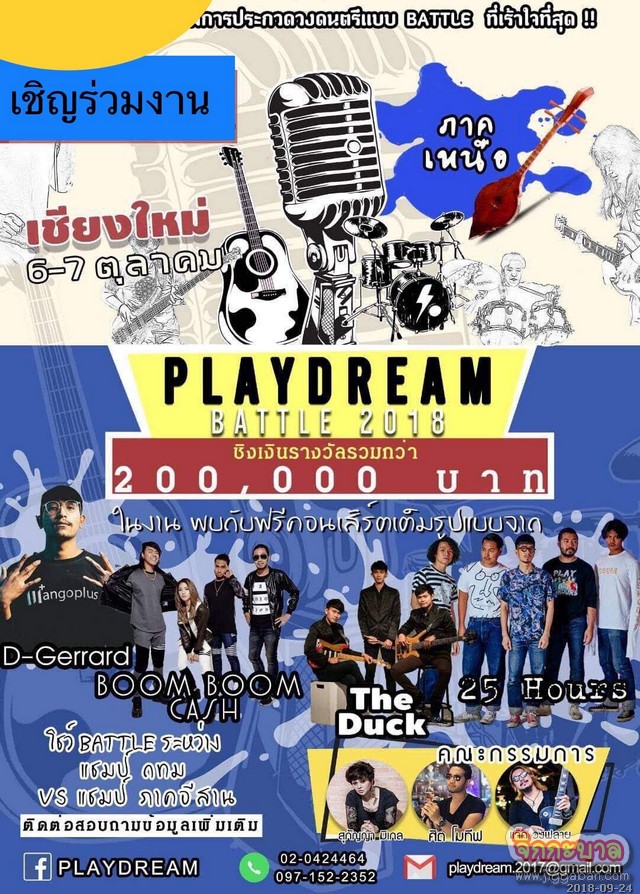ซึ่งนอกจาก 3 ตัวแม่ตัวพ่อที่จะขึ้นไปเป็นคณะกรรมการตัดสินเฟ้นหาช้างเผือกแล้วนั้น ภายในงานยังมีฟรีคอนเสิร์ตดี ๆ จากศิลปินคุณภาพมาให้ชาวเชียงใหม่ และจังหวัดใกล้เคียงได้เต็มอิ่มไปกับเสียงเพลงดี ๆ ดนตรีแน่น ๆ กันอีกด้วย โดยในวันที่ 6 ต.ค. 61 พบกับวง D Gerrard และวง Boom Boom Cash และในวันที่ 7 ต.ค. 61 พบกับวง 25 Hours ! ซึ่งทั้ง 2 วันนี้มี ปุ๊ย ตี10, ดีเจ.อิคคิว, และหนุ่มอารมณ์ดี ฟรอยด์ ณัฏฐพงษ์ ชาติพงศ์ รับหน้าที่พิธีกรตลอดทั้งงานกันอีกด้วย ! ถือเป็นกิจกรรมที่น่าสนับสนุนเป็นอย่างมาก เพราะถือเป็นการผลักดันให้เยาวชนไทยใช้เวลาว่างให้เป็นประโยชน์ ห่างไกลจากยาเสพติดได้เป็นอย่างดี !!! นอกจากนี้แล้วร็อกเกอร์สาวรุ่นใหญ่เจ้าเดิม ยังฝากทิ้งท้ายว่า…การประกวดจะถูกจัดขึ้นทั่วทุกภาคทั้ง 4 ภาค เพื่อเป็นตัวแทนเข้ามาชิงแชมป์เวทีใหญ่เวทีเงินล้านกันอีกครั้ง น้อง ๆ สองฝั่งทะเลของไทยอย่าได้น้อยหน้า รีบส่งผลงานเดโมกันเข้ามา เพื่อร่วมแข่งขันความเป็นหนึ่งของประเทศ โดยติดตามรายละเอียดต่าง ๆ ได้ที่ facebook Fanpage : Playdream และ Playdream Academy หรือช่องยูทูป Playdream Channel