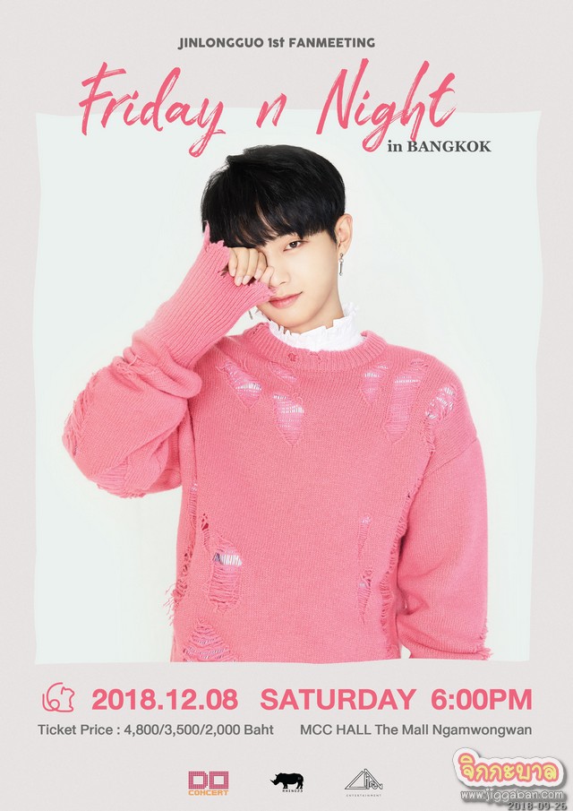 หลังจากปล่อยให้เพื่อนๆ สมาชิกวง JBJ จัดแฟนมีตติ้งในประเทศไทยกันไปแล้ว ก็ถึงเวลาของหนุ่มขี้อ้อนทาสแมวอย่าง “จินหลงกั๋ว” ที่จะได้ใกล้ชิดกับแฟนคลับชาวไทยในแฟนมีตติ้งครั้งแรกในประเทศไทย JIN LONG GUO 1st Fan Meeting ‘Friday n Night’ in Bangkok วันเสาร์ที่ 8 ธันวาคม 2561 เวลา 18:00 น. ณ เอ็มซีซีฮอลล์ เดอะมอลล์งามวงศ์วาน จัดโดย บริษัท ดูคอนเสิร์ต จำกัด