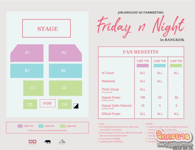 งานฟนมีตติ้ง JIN LONG GUO 1st Fan Meeting ‘Friday n Night’ in Bangkok ครั้งนี้ แฟน ๆ ชาวไทยจะได้รู้จักและใกล้ชิดกับจินหลงกั๋วมากขึ้นผ่านเสียงเพลง การพูดคุยและกิจกรรมต่าง ๆ มากมายภายในงาน พร้อมของขวัญสุดพิเศษ! ทุกที่นั่งจะได้ Hi-Touch สัมผัสมือกับหนุ่มสุดคิ้วท์ “จินหลงกั๋ว” อย่างใกล้ชิด สาว ๆ รีบเคลียร์คิวให้พร้อมแล้วมาสำลักความสุขส่งท้ายปีในงาน JIN LONG GUO 1st Fan Meeting ‘Friday n Night’ in Bangkok เปิดจำหน่ายบัตรวันเสาร์ที่ 27 ตุลาคม 2561 ทาง www.do-concert.com ตั้งแต่ 10.00 น. เป็นต้นไป บัตรราคา 4,800 / 3,500 / 2,000 บาท พร้อมรับสิทธิพิเศษมากมายแบบไม่ต้องลุ้นในทุกราคาบัตร ติดตามรายละเอียดเพิ่มเติมได้ที่แฮชแทค # #JinLongGuoFridaynNightinBKK เฟสบุ๊คแฟนเพจ www.facebook.com/doconcert และอินสตาแกรม doconcert_official