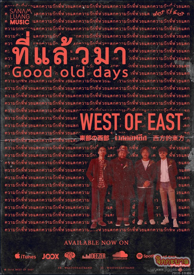 “เพลงนี้เศร้าที่สุดแล้วตั้งแต่เราทำเพลงมา” นั่นคือคำอธิบายดีกรีความเศร้าของ “ที่แล้วมา (Good Old Days)” ซิงเกิลล่าสุดจาก West of East วงโฟล์กร็อกเจ้าของรางวัลศิลปินหน้าใหม่ยอดเยี่ยมจากเวทีสีสันอะวอร์ดส์ครั้งที่ 29 ที่เรียกตัวเองว่าเป็นวงโฟล์กร็อกจริงใจจากมีนบุรี ซึ่งประกอบด้วย ไกด์-ชนะนันท์ จันทร (ร้องนำ, กีตาร์อะคูสติก), เตอร์-ณฐกร อินทรประเสริฐ (กีตาร์เบส), ปาร์ค-ฐิตินันท์ เกษร (กลอง) และ เอ็ม-ทวี เลิศลำ้ (คอรัส, เพอร์คัสชัน)