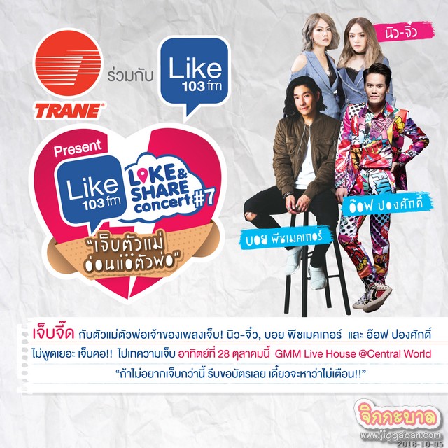 กลับมาสร้างความประทับใจอีกครั้งกับคอนเสิร์ตใหญ่ประจำปีของชาว 103 ไลค์ เอฟ เอ็ม สำหรับงาน ไลค์ แอนด์ แชร์ คอนเสิร์ต ครั้งที่7 ในตอน “เจ็บตัวพ่อ อ่อนแอตัวแม่” ที่ปีนี้ขอจัดเอาใจคนชอบเพลงเจ็บๆ กับ 3 ศิลปิน ตัวพ่อ ตัวแม่ ตัวแทนความเจ็บอย่าง นิว-จิ๋ว , บอย พีซเมคเกอร์ , อ๊อฟ ปองศักดิ์ ที่แต่ละคนจะมีความเจ็บในแบบฉบับของตัวเอง โดยอ๊อฟ กล่าวว่า “ถ้าในมุมของชีวิตจริงคนที่เข้ากับธีมคอนเซปต์งานที่สุดนะคืออ๊อฟ นี่ล่ะทั้งเจ็บทั้งอ่อนแอ มาแล้วแต่ตอนนี้แข็งแรงมาก คือหลายคนอาจมองว่าคอนตเสิร์ตนี้จะมีแต่เพลงช้า มีแต่ความเศร้า หรือจะต้องพกแต่ทิชชู่ไปซับน้ำตาตัวเองรึเปล่า พูดเลยไม่แน่นอนครับ เราจะเจ็บจะอ่อนแอ แบบมีความสุขก็ได้ อ๊อฟเชื่อว่าคอนเสิร์ตนี้จะมีหลายอารมณ์ และแน่นอนว่าจะได้ฟังเพลงที่ตอกย้ำความรู้สึกของคนชอบความเจ็บปวดได้ดี มาเจอกันครับในงาน ไลค์ แอนด์ แชร์ คอนเสิร์ต ครั้งที่ 7 ตอน”เจ็บตัวพ่อ อ่อนแอตัวแม่” ในวันอาทิตย์ที่ 28 ตุลาคมนี้ ที่ GMM Live House เซ็นทรัลเวิล์ด ติดตามกติการับบัตรได้ที่คลื่น 103 Like FM และ www.facebook.com/103likefm เลยครับ” อ๊อฟกล่าว