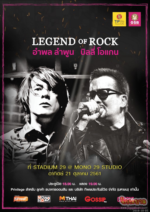 สำรับคอนเสิร์ต “GSB & TIPlife present LEGEND OF ROCK CONCERT” (จีเอสบี แอนด์ ทิพยไลฟ์ พรีเซนต์ รีเจ้นท์ ออฟ ร็อค คอนเสิร์ต) อำพล ลำพูน-บิลลี่ โอแกน จะจัดขึ้นในวันอาทิตย์ที่ 21 ตุลาคม 2561 เวลา 19.00 น. (เวลาประตูเปิด 18.00 น.) ณ Stadium 29 ถนนชัยพฤกษ์ จำนวนบัตร 1,500 ที่นั่ง ให้กับลูกค้าธนาคารออมสิน และ บมจ. ทิพยประกันชีวิต เท่านั้น ทั้งนี้รอลุ้นรับบัตรกันได้ทุกช่องทางของธนาคารออมสิน และบมจ. ทิพยประกันชีวิต ตั้งแต่วันนี้เป็นต้นไป