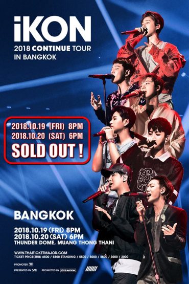 18 ตุลาคม 2561 กรุงเทพฯ ประเทศไทย :- บัตรหมดเกลี้ยงทั้ง 2 รอบแสดงตามคาด! SOLD OUT ไปแบบไม่ต้องพูดอะไรเยอะ!! สำหรับคอนเสิร์ต “ไอคอน 2018 คอนทินิว ทัวร์ อิน แบงคอก” (iKON 2018 CONTINUE TOUR IN BANGKOK) ยืนยันได้ดีถึงกระแสตอบรับสุดร้อนแรงที่เหล่าไอคอนิก (iKONIC ชื่อกลุ่มแฟนคลับของ iKON) ชาวไทยมีต่อ “ไอคอน” (iKON) กลุ่มศิลปินเคป็อปตัวท็อปซึ่งมาเมืองไทยกี่ครั้งก็ปังทุกรอบจริงๆ และรอบนี้จะยิ่งอลังกว่าเดิม! เพราะผู้จัดมากประสบการณ์อย่าง โฟร์ วัน วัน เอ็นเตอร์เทนเม้นท์ (Four One One Entertainment Co.,Ltd.) นำทีมโดย กึ้ง–เฉลิมชัย มหากิจศิริ จับมือกับค่ายเพลงยักษ์ใหญ่แห่งประเทศเกาหลีใต้ วายจี เอ็นเตอร์เทนเม้นท์ (YG Entertainment) เสริมทัพด้วยบริษัทด้านธุรกิจบันเทิงยักษ์ใหญ่ระดับโลกอย่าง ไลฟ์ เนชั่น เอนเตอร์เทนเม้นท์ (Live Nation Entertainment) จะร่วมกันจัดหนักถึงใจแน่นอนกับคอนเสิร์ตเต็มรูปแบบของหนุ่มๆ “ไอคอน” ทั้ง 7 คนซึ่งกำลังจะเกิดขึ้นในวันศุกร์ที่ 19 และวันเสาร์ที่ 20 ตุลาคม 2561 นี้ ณ ธันเดอร์โดม เมืองทองธานี
