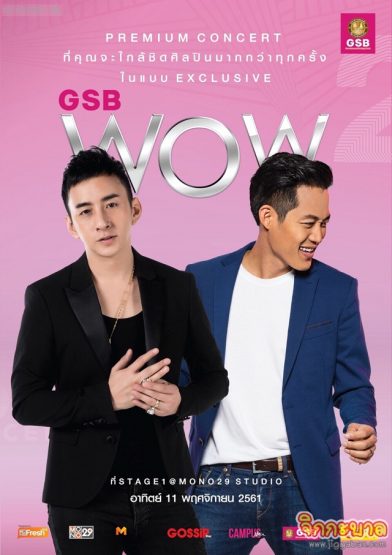 ภายใต้รูปแบบคอนเสิร์ตทั้ง 3 แบบ คือ 2 Tone Concert, Rewind 6 Degree และ Diva จากศิลปินชั้นนำของเมืองไทย พร้อมด้วยโปรดักชั่นสุดอลังการบนเวทีคอนเสิร์ตกับจอแอลอีดี 270 องศา พร้อมแสง สี เสียงตระการตา เพื่อเป็นการขอบคุณให้ลูกค้าคนพิเศษของธนาคารออมสินได้เข้าชมฟรี ล่าสุดกับคอนเสิร์ตส่งท้ายปี 2561 ในเดือนพฤศจิกายนนี้ กับคอนเสิร์ต “GSB WOW CONCERT” ในรูปแบบ 2 Tone Concert ที่ได้สองศิลปินหนุ่มต่างยุค ที่หลงใหลในแนวดนตรีป๊อป-อาร์แอนด์บีเหมือนกัน กับ บี-พีระพัฒน์ เถรว่อง และ ตู่-ภพธร สุนทรญาณกิจ ที่จะมาร้อง-เต้น พร้อมโชว์สุดพิเศษที่ร่วมกันสรรสร้างเพื่อคอนเสิร์ตนี้โดยเฉพาะ พบกันในวันอาทิตย์ที่ 11 พฤศจิกายน 2561 เวลาการแสดง 14.00 น. (เวลาประตูเปิด 13.00 น.) ณ Stage1 MONO29 STUDIO (สเตจ1 โมโนทเวนตี้ไนน์ สตูดิโอ) ถนนชัยพฤกษ์ สนใจร่วมกิจกรรม ติดตามรายละเอียดการรับบัตรคอนเสิร์ตได้ที่ www.gsb.or.th