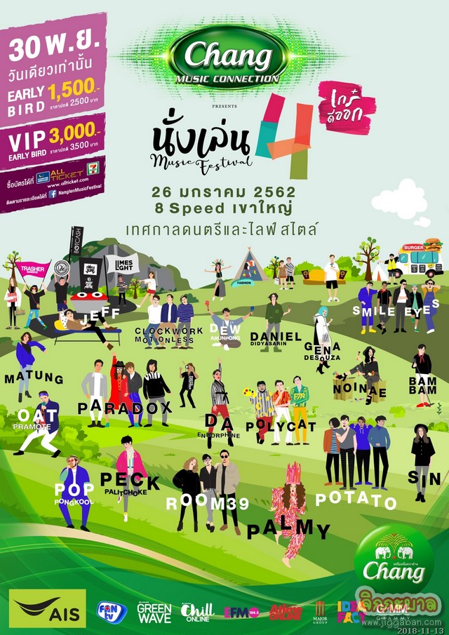 ไม่ควรพลาดเป็นอย่างยิ่งกับ ช้าง มิวสิค คอนเนคชั่น พรีเซนต์ นั่งเล่น มิวสิค เฟสติวัล 4 เป็นมิวสิค ไลฟ์สไตล์ เฟสติวัล สำหรับทุกเพศทุกวัย เตรียมตัวให้พร้อมแล้วไปสนุกกันกับบรรยากาศสุดฟินที่ทุกคนรอคอย ซึ่งจะจัดขึ้นในวันเสาร์ที่ 26 มกราคม 2562 ณ 8 Speed (แปด สปีด) เขาใหญ่ จ.นครราชสีมา โดยเปิดจำหน่ายบัตร EARLY BIRD 1,500 บาท (ราคาปกติ 2,500 บาท) และ VIP EARLY BIRD 3,000 บาท (ราคาปกติ 3,500 บาท) ในวันที่ 30 พฤศจิกายนนี้ เพียงวันเดียวเท่านั้น!!! ซื้อบัตรได้ที่เคาน์เตอร์เซอร์วิส ออลล์ ทิคเก็ต ในร้านเซเว่นอีเลฟเว่น ทั่วประเทศ หรือ www.allticket.com สามารถติดตามรายละเอียดเพิ่มเติมที่ FB : NanglenMusicFestival