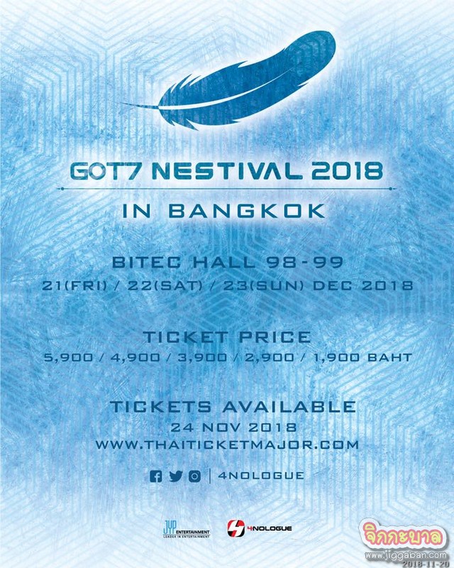 4NOLOGUE (โฟร์โนล็อค) จับมือกับ JYP Entertainment (เจวายพี เอ็นเตอร์เทนเม้นท์) ส่ง 7 หนุ่ม “GOT7” ประกอบด้วย “เจบี (JB), มาร์ค (Mark), จินยอง (Jin Young), แบมแบม (BamBam), ยองแจ (Young Jae), แจ็คสัน (Jackson)” และ “ยูคยอม (Yugyeom)” จัดโชว์สุดพิเศษเพื่อเหล่าอากาเซ ใน 4NOLOGUE PRESENTS “GOT7 NESTIVAL 2018 IN BANGKOK” เพื่อมอบความสุขส่งท้ายปีโดยเฉพาะ กับโชว์ที่ใหญ่ที่สุดทั้งแต่เคยมีมา และมีแค่ที่ประเทศไทยเท่านั้น!!