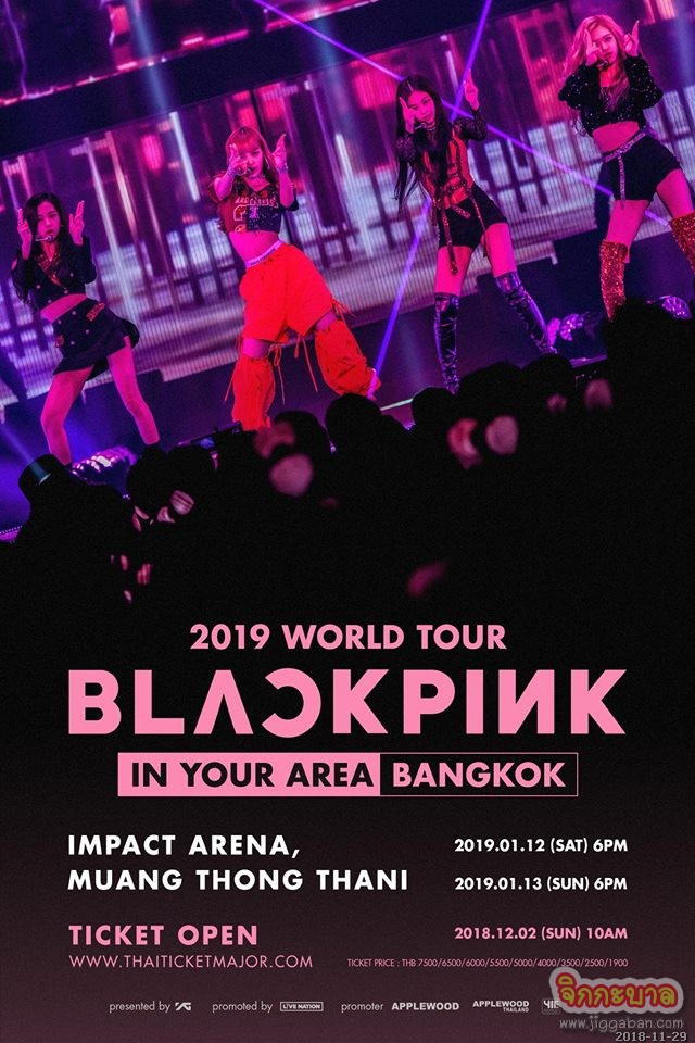 ปักหมุดคิวแรก เปิดศักราช 2019 สุดยิ่งใหญ่ สาแก่ใจชาวบลิ๊งค์ (BLINK ชื่อเรียกแฟนคลับ BLACKPINK) ทั้งหมดทั้งมวล ชนิดที่ว่าสิ้นสุดการรอคอยขนานแท้ เมื่อสี่สาว “แบล็กพิงค์” (BLACKPINK) ทั้ง จีซู (JISOO), เจนนี่ (JENNIE) , โรเซ่ (ROSÉ) และ ลิซ่า (LISA) ขอตัดริบบิ้นตารางเวิลด์ทัวร์ของพวกเธอกันที่ประเทศไทยเป็นคิวแรก ในคอนเสิร์ต “แบล็กพิงค์ 2019 เวิลด์ ทัวร์ [อิน ยัวร์ แอเรีย] แบงคอก” (BLACKPINK 2019 WORLD TOUR [IN YOUR AREA] BANGKOK) ซึ่งงานนี้ผู้จัด โฟร์วันวันฯ จับมือทำงานร่วมกับเหล่าพันธมิตรได้แก่ แอปเปิลวูด ประเทศเกาหลีใต้ (APPLEWOOD KOREA) / แอปเปิลวูด ไทยแลนด์ (APPLEWOOD THAILAND) / วายจี เอ็นเตอร์เทนเม้นท์ (YG Entertainment) และ ไลฟ์ เนชั่น เอ็นเตอร์เทนเม้นท์ (Live Nation Entertainment) กำหนดแสดงไว้เป็น 2 รอบ 2 วันด้วยกันคือ เสาร์ที่ 12 และ อาทิตย์ที่ 13 มกราคม 2562 เวลา 18:00 น. ณ อิมแพ็ค อารีน่า เมืองทองธานี ** โดยจะเริ่มเปิดจำหน่ายบัตรในวันอาทิตย์ที่ 2 ธันวาคม 2561 ที่จะถึงนี้ ตั้งแต่เวลา 10:00 น. เป็นต้นไป ณ จุดจำหน่ายไทยทิคเก็ตเมเจอร์ ทุกสาขา และระบบออนไลน์ทาง www.thaiticketmajor.com บัตรราคา 1,900 / 2,500 / 3,500 / 4,000 / 5,000 / 5,500 / 6,000 (บัตรยืน) / 6500 (บัตรนั่ง) และ 7,500 บาท (บัตรนั่ง)
