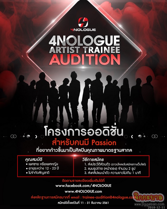 หลังจาก 9 นายเดบิวต์ 4NOLOGUE (โฟร์โนล็อค) ถูกยกให้เป็นผู้คืนลมหายใจให้กับ T-POP และยังเป็นผู้สร้างมาตรฐานใหม่ให้กับศิลปินไทย รวมถึงเป็นสังกัดที่ศิลปินฝึกหัดอยากเข้ามากที่สุด ด้วยกระบวนการฝึกร้อง ฝึกเต้น ที่มีมาตรฐานการันตีด้วยการร่วมงานกับคนเบื้องหน้าและเบื้องหลังระดับ Global มาแล้วนับไม่ถ้วน และจากกระแสตอบรับสุดร้อนแรง งานนี้ “วุธ-อนุวัติ วิเชียรณรัตน์” บอสใหญ่โฟร์โนล็อค สั่งลุยเปิดโครงการออดิชั่น “4NOLOGUE Artist Trainee Audition” ตามหาคนมี Passion ที่อยากก้าวขึ้นมาเป็นศิลปินคุณภาพมาตรฐานสากล หากคุณมีคุณสมบัติต่อไปนี้ รายงานตัวด่วน! 1. เพศชาย/เพศหญิง 2. อายุระหว่าง 12-23 ปี 3. ไม่จำกัดสัญชาติ ดาวน์โหลดใบสมัครได้ที่ www.4NOLOGUE.com และส่งรายละเอียดการสมัครมาที่ Email : trainee-audition@4nologue.com ตั้งแต่ที่ 11-31 ธันวาคม 2561 โอกาสที่จะได้เดบิวต์เป็นศิลปิน ที่จะได้ทำงานระดับมาตรฐานสากลอยู่ไม่ไกลเกินเอื้อม