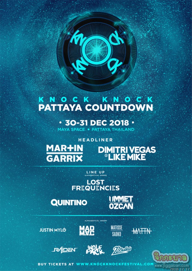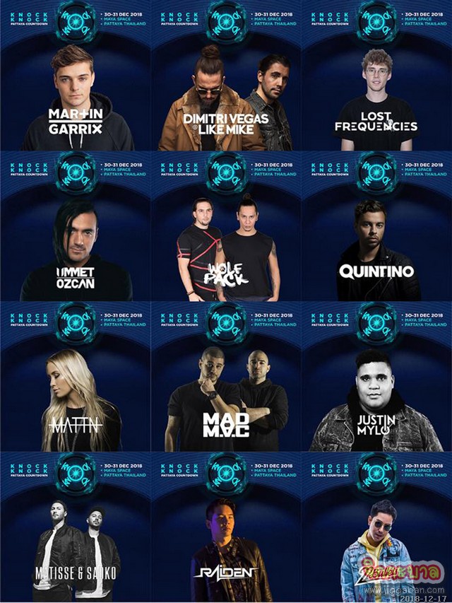 Festival ที่ทำให้ Music Festival ฝีมือคนไทยเป็นที่รู้จักไปทั่วโลกมาแล้ว มาดำเนินกิจกรรมภายในงานKNOCK KNOCK PATTAYA COUNTDOWN 2018 นี้ โดยจัดเต็มกับ Line Up ดีเจระดับโลก นำโดยMartin Garrix ดีเจอันดับ 1 ของโลก พร้อมด้วย Dimitri Vegas & Like Mike / Lost Frequencies / Ummet Ozcan / Quintino / Wolfpack / MATTN / Justin Mylo / Matisse & Sadko / MAD M.A.C / Raiden / 22Bulletsซึ่งทั้งหมดนี้จะขึ้นระเบิดความมันส์อย่างต่อเนื่องบนเวทีเดียวกัน โดยงานนี้จะเกิดขึ้น 2 วัน ในวันที่ 30 และ 31 ธันวาคม นี้ ณ MAYA SPACE พัทยา โดยคาดการณ์ผู้เข้าร่วมงานทั้ง2 วันรวมแล้วไม่ต่ำกว่า 50,000 คน สำหรับผู้ที่สนใจ สามารถดูรายละเอียดกิจกรรมและซื้อบัตรได้แล้ววันนี้ ที่ www.knockknockfestival.com