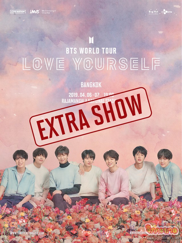 บัตร Sold Out ตามคาด สำหรับคอนเสิร์ต BTS WORLD TOUR ‘LOVE YOURSELF’ BANGKOK เวิลด์ทัวร์ของ 7 หนุ่ม BTS ไอดอลแถวหน้าของประเทศเกาหลีที่่โด่งดังถึงระดับโลก นำโดย อาร์เอ็ม ( RM ) , จิน ( Jin ) , ชูก้า ( Suga ) , เจโฮป ( J-Hope ) , จีมิน ( Jimin ) , วี ( V ) และ จองกุก ( Jungkook ) ที่จัดขึ้น วันที่ 6 เมษายน 2562 ณ ราชมังคลากีฬาสถาน สนามกีฬาที่ใหญ่ที่สุดในประเทศบัตร 40,000 กว่าใบถูกจำหน่ายหมดเกลี้ยงในพริบตา โดยงานนี้ผู้จัดอย่าง ไอเอ็มอี โปรดักชันส์ ( ประเทศไทย ) จำกัด หรือ ไอมี่ไทยแลนด์ ( iMe Thailand ) จับมือ Bighit Entertainment ร่วมสร้างประวัติศาสตร์หน้าใหม่ในการจัดคอนเสิร์ตใหญ่ของศิลปินเกาหลีในประเทศไทย กับคติที่ว่า เล็กๆ ไม่ ใหญ่ๆ เท่านั้นที่จัดให้!!!