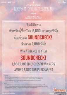 สำหรับคอนเสิร์ต BTS WORLD TOUR ‘LOVE YOURSELF’ BANGKOK ที่กำลังจะเกิดขึ้นในวันที่ 6 -7เมษายน 2562 ณ สนามราชมังคลากีฬาสถานนั้น จะอัดแน่นไปด้วยแสง สี เสียงสุดอลังการ รวมถึงโชว์สุดท๊อปฟอร์มจากทั้ง 7 หนุ่ม ขอให้ทุกคนวอร์มร่างกาย และเสียงกรี๊ดมาให้พร้อม เพราะตลอดกว่า 2 ชั่วโมง คุณจะไม่มีเวลาได้พักหายใจหายคอแน่นอน !!