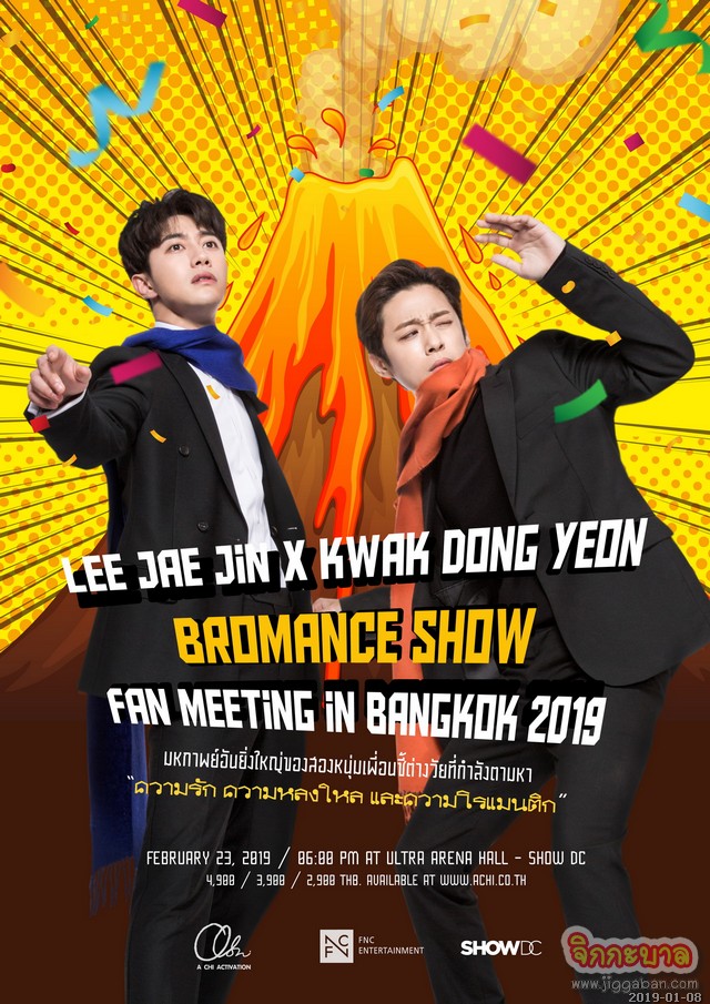 หลังจาก อะชิ แอคทิเวชั่น (A CHI ACTIVATION) ผู้จัดไฟแรงที่เสิร์ฟผลงานระดับพรีเมี่ยมให้แฟนๆ ชาวไทยได้ฟินกันต่อเนื่อง แย้มข่าวดีที่ทำเอาฮือฮาส่งท้ายปีจอ ด้วยโปรเจ็กใหม่สุดเซอร์ไพรส์โดนใจแฟนคลับของสองหนุ่มพี่น้องต่างสายเลือดจากสังกัด เอฟเอ็นซี เอ็นเตอร์เทนเมนท์ (FNC Entertainment) อย่าง อีแจจิน (LEE JAE JIN) มือเบสสุดเท่ห์ของวงดนตรี เอฟทีไอส์แลนด์ (FTISLAND) และนักแสดงหนุ่มมาแรง กวักดงยอน (KWAK DONG YEON) ซึ่งจะแพ็คคู่มาจัดกิจกรรมแฟนมีตติ้งที่เมืองไทย… ล่าสุด! รายละเอียดที่ทุกคนรอคอยก็เผยออกมาแล้ว!! เตรียมแคะกระปุก เคลียร์คิว และกาปฏิทินตัวโตๆ เน้นๆ กันล่วงหน้าว่า เรากำลังจะมีนัดกันที่งาน อีแจจิน x กวักดงยอน ‘โบรแมนซ์ โชว์’ แฟน มีตติ้ง อิน แบงคอก 2019 (Lee Jae Jin x Kwak Dong Yeon ‘Bromance Show’ Fan Meeting in Bangkok 2019) มหากาพย์อันยิ่งใหญ่ของสองหนุ่มเพี่อนซี้ต่างวัยที่กำลังตามหาความรัก, ความหลงใหล และความโรแมนติก ในวันเสาร์ที่ 23 กุมภาพันธ์ 2562 นี้ ณ อัลตร้า อารีน่า ฮอลล์ ชั้น 6 ศูนย์การค้าโชว์ ดีซี