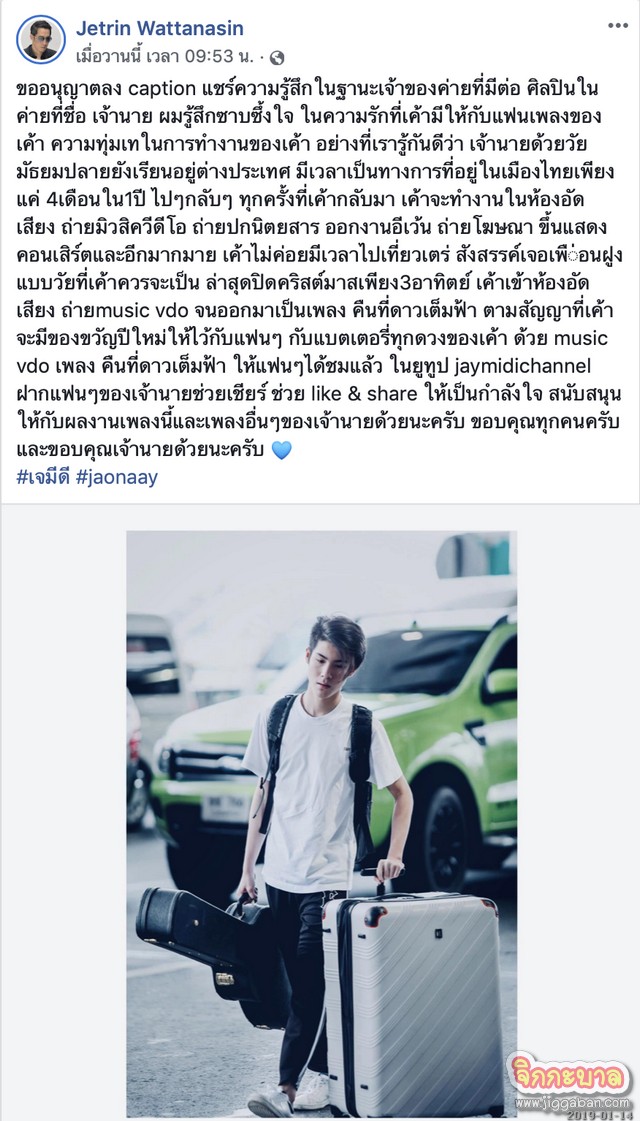 ขออนุญาตลง caption แชร์ความรู้สึกในฐานะเจ้าของค่ายที่มีต่อ ศิลปินในค่ายที่ชื่อ เจ้านาย ผมรู้สึกซาบซึ้งใจ ในความรักที่เค้ามีให้กับแฟนเพลงของเค้า ความทุ่มเทในการทำงานของเค้า อย่างที่เรารู้กันดีว่า เจ้านายด้วยวัยมัธยมปลายยังเรียนอยู่ต่างประเทศ มีเวลาเป็นทางการที่อยู่ในเมืองไทยเพียงแค่ 4เดือนใน1ปี ไปๆกลับๆ ทุกครั้งที่เค้ากลับมา เค้าจะทำงานในห้องอัดเสียง ถ่ายมิวสิควีดีโอ ถ่ายปกนิตยสาร ออกงานอีเว้น ถ่ายโฆษณา ขึ้นแสดงคอนเสิร์ตและอีกมากมาย เค้าไม่ค่อยมีเวลาไปเที่ยวเตร่ สังสรรค์เจอเพื่อนฝูง แบบวัยที่เค้าควรจะเป็น ล่าสุดปิดคริสต์มาสเพียง3อาทิตย์ เค้าเข้าห้องอัดเสียง ถ่ายmusic vdo จนออกมาเป็นเพลง คืนที่ดาวเต็มฟ้า ตามสัญญาที่เค้าจะมีของขวัญปีใหม่ให้ไว้กับแฟนๆ กับแบตเตอรี่ทุกดวงของเค้า ด้วย music vdo เพลง คืนที่ดาวเต็มฟ้า ให้แฟนๆได้ชมแล้ว ในยูทูป jaymidichannel ฝากแฟนๆของเจ้านายช่วยเชียร์ ช่วย like & share ให้เป็นกำลังใจ สนับสนุนให้กับผลงานเพลงนี้และเพลงอื่นๆของเจ้านายด้วยนะครับ ขอบคุณทุกคนครับ และขอบคุณเจ้านายด้วยนะครับ #เจมีดี #jaonaay