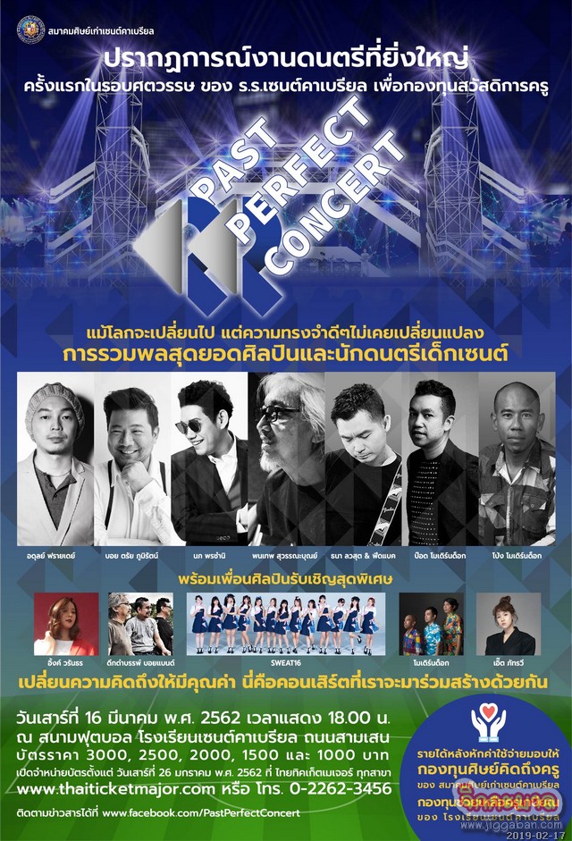 “Past Perfect Concert” วันเสาร์ที่ 16 มีนาคมนี้ เวลา 18.00 น. ณ สนามฟุตบอล โรงเรียนเซนต์คาเบรียล ถนนสามเสน บัตรราคา 3,000/2,500/2,000/1,500 และ 1,000 จองบัตรได้แล้ววันนี้ที่ www.thaiticketmajor.com และขอความร่วมมือจากผู้สนใจทุกท่าน ในการใช้บริการรถสาธารณะเพื่อเดินทางมาร่วมชมการแสดง
