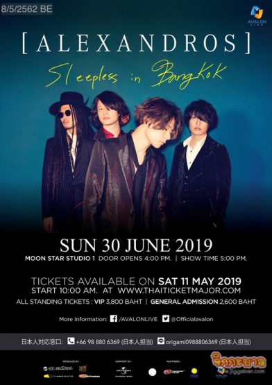 เป็นอีกหนึ่งงานที่กระแสดีสุดๆ หลังจากผู้จัดมากคุณภาพอย่าง “AVALON LIVE” (อาวาลอน ไลฟ์) ประกาศว่าจะพา 4 หนุ่ม [ALEXANDROS] (อเล็กซานดรอส) บินตรงมาเปิดคอนเสิร์ตครั้งแรกในประเทศไทย งานนี้ทั้งศิลปินและแฟนคลับต่างก็ตื่นเต้นไม่แพ้กัน เพราะใกล้เข้ามาแล้วสำหรับวันจองบัตร[ALEXANDROS] Sleepless in Bangkok (อเล็กซานดรอส สลีพเลส อิน แบงคอก) ที่จะจัดงานขึ้นในวันอาทิตย์ที่ 30 มิถุนายน 2562 ณ Moon Star Studio 1 ปักหมุดดีเดย์วันขายบัตรเสาร์นี้ 11 พฤษภาคม 2562 ตั้งแต่ 10 โมงเป็นต้นไป
