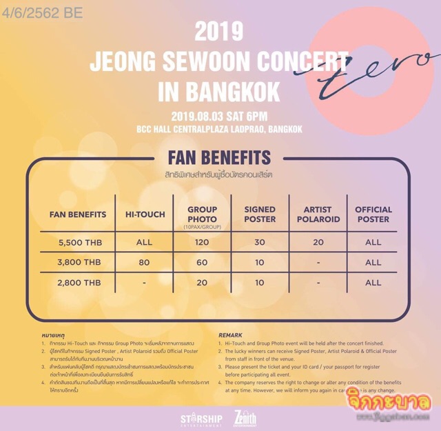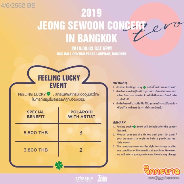 นอกจากจะได้ชมโชว์หนุ่มหล่อพร้อมดนตรีสดที่ขนกันมาเต็มเวทีแล้ว ความพิเศษอีกอย่างคือประเทศไทย คือที่แรกในต่างประเทศ!!! ที่หนุ่ม จอง เซอุน เลือกมาแสดง แค่นี้ก็พิเศษสุดๆ แล้ว แฮงอุนทั้งหลายเตรียมใจให้พร้อมรับความสนุกและความประทับใจ ความพิเศษอีกมากมายที่จะเกิดขึ้นที่งาน 2019 JEONG SEWOON CONCERT “ZERO” in Bangkok ในวันที่ 3 สิงหาคม 2562 เวลา 18.00 น. ณ BCC Hall CentralPlaza Ladprao เริ่มจำหน่ายบัตรวันที่ 2 มิถุนายน 2562 เวลา 10.00 น. เป็นต้นไปทาง http://www.zenithentthailand.com บัตรราคา 5,500 / 3,800 และ 2,800 บาท