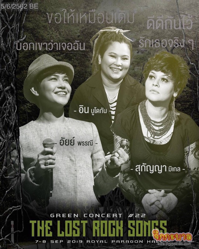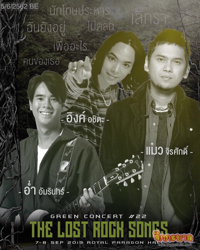 THE LOST ROCK SONGS เตรียมตัวมาให้พร้อมแล้วมา #ปลดล็อคเพลงรักแบบร็อคๆ ไปด้วยกัน ในวันที่ 7 และ 8 กันยายน 2562 (รอบวันเสาร์ 19.00 น. / วันอาทิตย์ 17.00 น.) ณ รอยัลพารากอน ฮอลล์ เริ่มจำหน่ายบัตรวันที่ 7 มิถุนายนนี้ เป็นต้นไป ที่ไทยทิคเก็ตเมเจอร์ทุกสาขา บัตรราคา 5,000 / 4,500 / 4,000 / 3,500 / 3,000 / 2,500 และ 2,000 รายได้ส่วนหนึ่งเพื่อจัดซื้ออุปกรณ์ลาดตระเวนเพื่อผู้พิทักษ์ป่า รายละเอียดเพิ่มเติมติดตามได้ที่ กรีนเวฟ 106.5 เอฟเอ็ม Facebook : Greenwave Fanpage และ ATime Showbiz