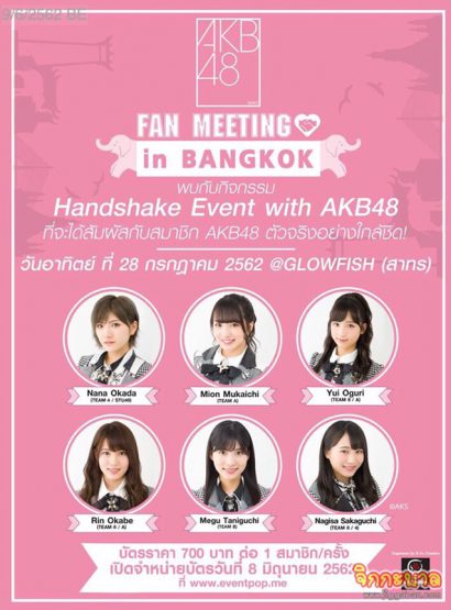 โดยใครสนใจกิจกรรม Handshake Event with AKB48 บัตรราคา 700 บาท / 1 สมาชิก ส่วนกิจกรรม Fan Meeting with AKB48 บัตรราคา 1,000 บาท สามารถซื้อบัตรกันได้แล้วทาง www.eventpop.me และติดตามรายละเอียดเพิ่มเติมเร็วๆนี้ได้ที่ www.gyucreative.com