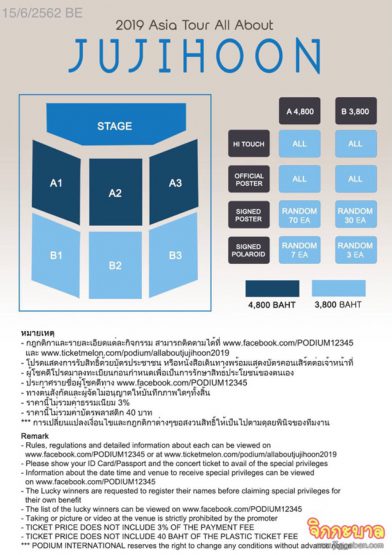 งาน “2019 Asia Tour All About JUJIHOON” แฟนมีตติ้งต้อนรับหน้าร้อนปี 2019 จะจัดขึ้นในวันเสาร์ ที่ 3 สิงหาคม 2562 เวลา 18.00 น. เป็นต้นไป ณ ULTRA ARENA SHOWDC กรุงเทพฯ บัตรราคา 3,800 และ 4,800 บาท เริ่มจำหน่ายบัตรตั้งแต่วันที่ 22 มิถุนายนนี้ เวลา 11.00 น. เป็นต้นไป ผ่านช่องทางการจำหน่ายบัตร www.ticketmelon.com หรือคลิ๊ก https://www.ticketmelon.com/podium/allaboutjujihoon2019 สอบถามข้อมูลและติดตามข่าวสารเพิ่มเติมได้ที่ https://www.facebook.com/PODIUM12345/
