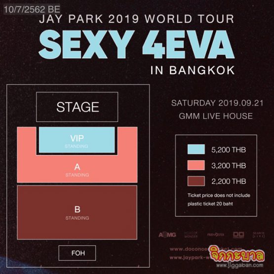 JAY PARK 2019 WORLD TOUR SEXY 4EVA IN BANGKOK พร้อมเปิดจำหน่ายบัตรวันเสาร์ที่ 13 กรกฎาคม 2562 ทาง www.doconcert-ticket.com บัตรราคา 5,200 (VIP)/3,200/2,200 บาท (บัตรยืนทั้งหมด) บาท พิเศษเฉพาะประเทศไทยเท่านั้น สามารถลุ้นรับสิทธิพิเศษ Hi-Touch / Group Photo / Signed Poster และ Signed Album ตามเงื่อนไขของบัตรแต่ละราคาอีกด้วย สามารถติดตามความเคลื่อนไหวตลอดกิจกรรมได้ที่ www.facebook.com/doconcert และทวิตเตอร์ @doconcert หรือแฮชแทค #JAYPARKSEXY4EVAINBKK